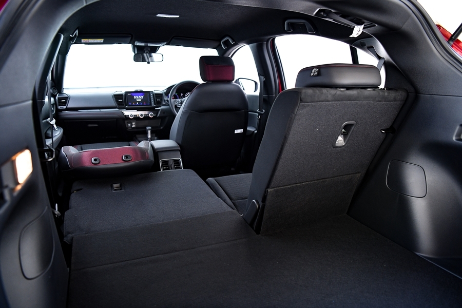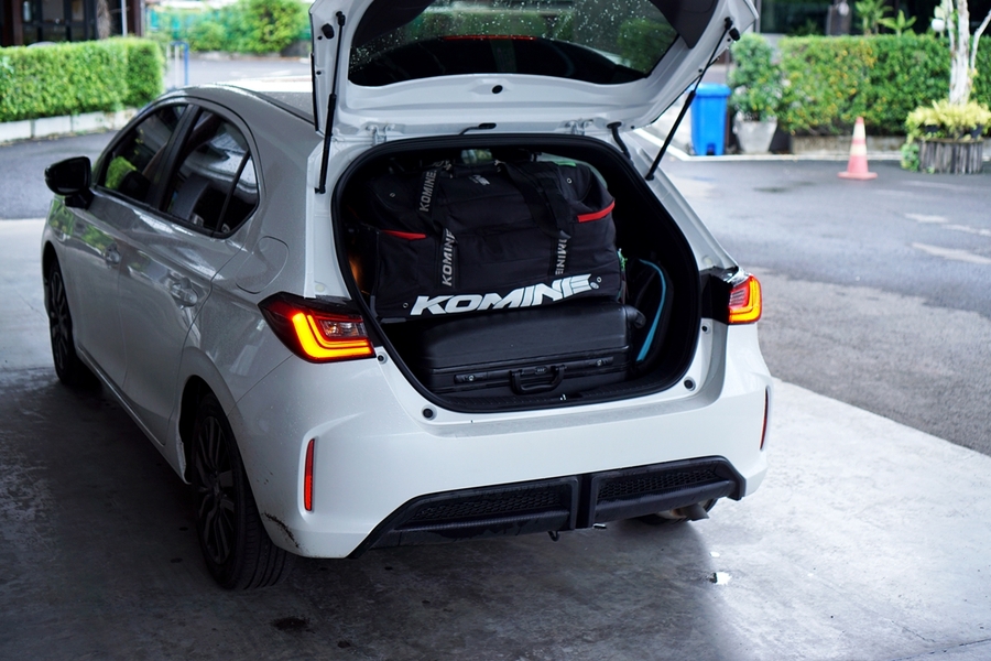 การเดินทางพร้อมสัมภาระที่มากกว่าทั่วไปเพราะนอกจากกระเป๋าเดินทาง ยังมีกระเป๋าใส่อุปกรณ์ชุดขี่ที่ใหญ่และหนักกกว่ามากอีกใบนั่นหมายถึงคนเดียวต้องมีสัมภาระอย่างน้อย 2 ใบ ผู้เขียนมี 3 เพิ่มเติมกระเป๋าโน๊ตบุ๊คเพื่อไปทำงานอีกชิ้น แต่นั่นยังไม่ท้าทายพลังขับเคลื่อนฟูลไฮบริดในฮอนด้า ซิตี้ อี:เอชอีวี มากพอเพราะงานนี้มีผู้โดยสารนั่งไปด้วยอีก 2 คน พร้อมสัมภาระแบบเดียวกันอีก 2 ชุด รายการสัมภาระจึงมีมากถึง 7 ใบ พร้อมนั่ง 3 คน การเป็นรถแฮทช์แบ็กที่หลายคนอาจมองว่าเล็กและเหมาะกับวัยรุ่นหรือเน้นใช้งานในเมืองคล่องตัวดูจะเป็นเรื่องไม่ถูกต้องนัก เพราะอัตถประโยชน์ของรถแฮทช์แบ็กจริงๆ แล้วมากกว่ารุ่นซีดาน ครั้งนี้ก็พิสูจน์ได้ชัดเพราะจัดวางของได้ครบพร้อมคนนั่งกันแบบสบายๆ ภายในห้องโดยสารที่ยังเหลือพื้นที่รอบตัวมาก และไม่รู้สึกอึดอัดเคล็ดลับก็เพียงพับเบาะหลังในส่วน 60 จาก 60/40 ลงราบไปกับแนวพื้นรถด้านหลังกว้างพอลงกระเป๋าใบใหญ่ตามแนวขวางและบนพื้นหลังเบาะที่พับเรียบก็วางได้อีก 2 ใบใหญ่ซ้อนกันยังเหลือช่องว่างให้เสียบกระเป๋าเดินทางขนาดย่อมแบบใส่เสื้อผ้า 3 วัน 2 คืนได้อีก 3 ใบ อย่างไรก็ตามน้ำหนักที่โหลดมากทางด้านหลัง ส่วนหนึ่งก็มีแบตเตอรี่ของระบบไฮบริดด้วยทำให้ช่วงล่างด้านหลังยุบลงมาจนสังเกตุได้ชัด ด้านหน้าจะออกอาการลอยนิดๆ ด้านการขับขี่จะเป็นอย่างไร โดยเฉพาะการขับทางไกล