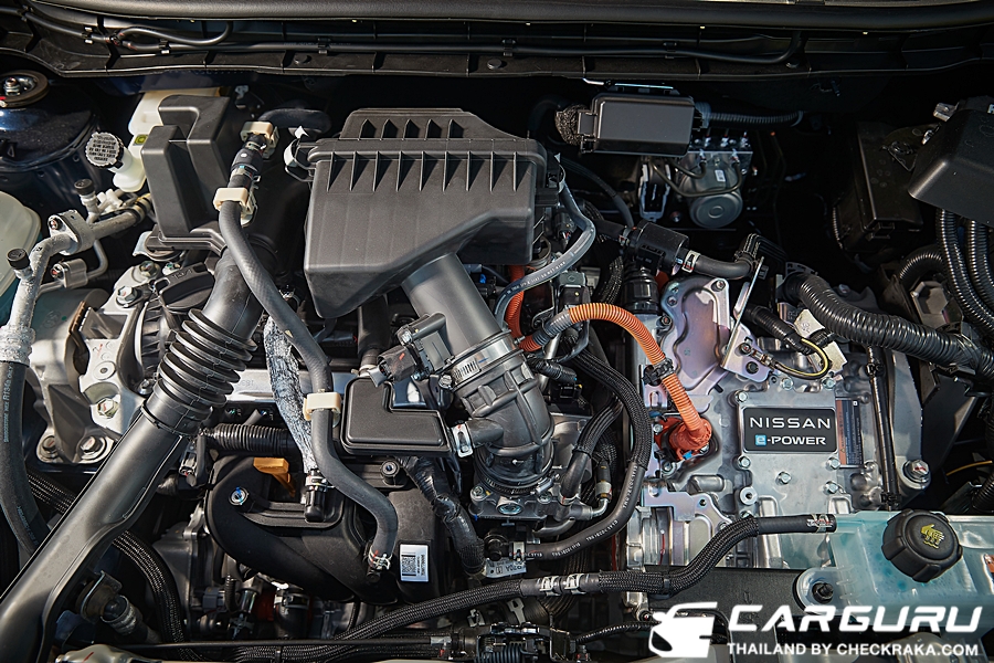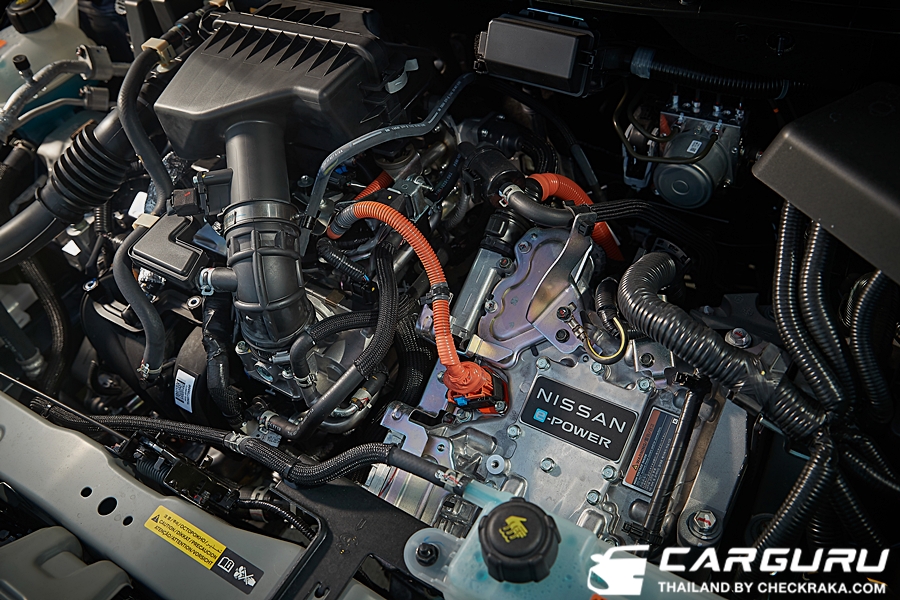 เครื่องยนต์สันดาปภายในของระบบอี-พาวเวอร์ ได้ถูกกำหนดให้มีการทำงานในรอบเครื่องยนต์ที่เหมาะสมที่สุดในการผลิตกระแสไฟฟ้าและให้ความประหยัดน้ำมันเชื้อเพลิงได้อย่างดีเยี่ยม โดยยังคงใช้เครื่องยนต์ HR12DE ขนาด 1.2 ลิตร 3 สูบแถวเรียง DOHC (Double Overhead Camshaft) 12 วาล์ว ความจุถังน้ำมันเชื้อเพลิง 41 ลิตร ทำหน้าที่เป็นเครื่องกำเนิดไฟฟ้า ต่อพ่วงไปยังส่วนประกอบของระบบขับเคลื่อนด้วยไฟฟ้าที่สำคัญ ๆ คือ เครื่องแปลงกระแสไฟฟ้า (Inverter) มอเตอร์ไฟฟ้า EM47 ชนิด AC3 Synchronous Motor (Electric Motor) ที่ให้กำลังสูงสุด 136 แรงม้า (PS) (100 กิโลวัตต์) ที่ 3,410-9,697 รอบต่อนาที แรงบิดสูงสุด 280 นิวตันเมตร (Nm) (28.6 กก.-ม.) ที่ 0~3,410 รอบต่อนาที