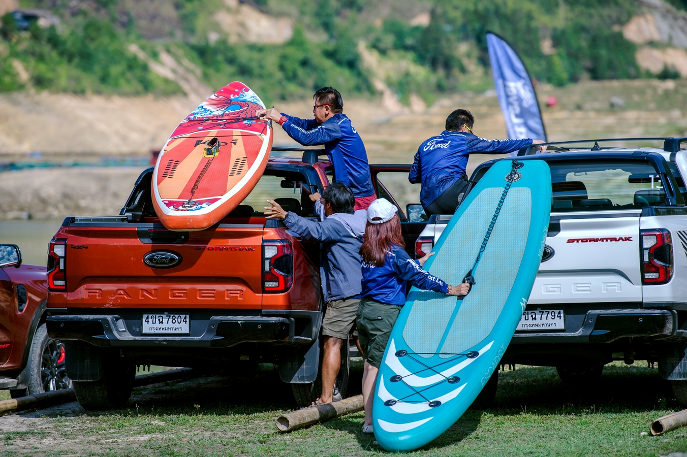 วันที่ 3 เป็นวันที่เราต้องกลับไปยังทะเลสาบ Seo My Ty แต่พาหนะของเราในวันนี้เปลี่ยนไปเป็นฟอร์ด เรนเจอร์ รุ่นสตอร์มแทรค ที่ติดตั้งเครื่องยนต์ดีเซลเทอร์โบ 2.0 ลิตร ให้กำลังสูงสุด 210 แรงม้า แรงบิด 500 นิวตันเมตร เกียร์อัตโนมัติ 10 สปีด แบบ E-Shifter เช่นกัน พร้อมเทคโนโลยีช่วยจอดอัจฉริยะครั้งแรกในตลาดรถกระบะ โดดเด่นกับราวหลังคาและสปอร์ตบาร์แบบปรับได้ เลื่อนจุดล็อคได้ 5 ตำแหน่ง ซึ่งการขับกลับขึ้นเขาที่ได้ขับมาวันก่อนหน้าด้วยรุ่นแร็พเตอร์เป็นไปอย่างสะดวกและง่ายขึ้น ตัวถังรถที่กว้างถึง 1,918 มม. นั่งสบายกับพื้นที่ภายในห้องโดยสาร แต่การขับสวนเลนกับทั้งรถกระบะและมอเตอร์ไซค์คนในพื้นที่ บางช่วงซ้ายหน้าผา ขวาเป็นเหว ที่กั้นทางไม่มีอยู่แล้ว กลับไม่ได้สร้างความลำบากมากนักเพราะมั่นใจกับระบบขับเคลื่อนที่ยึดเกาะบนถนนด้านนึง แม้อีกด้านเป็นไหล่ทางธรรมชาติ เมื่อเรามาถึงทะเลสาบเซียวมีที Seo My Ty ที่อยู่สูงจากระดับน้ำทะเล 1,600 เมตร ล้อมรอบด้วยภูเขาและทุ่งนาขั้นบันได ก็เตรียมพร้อมกับการทดสอบพิเศษ 3 สถานีที่ทางฟอร์ดได้จัดเตรียมรอไว้ สถานีแรกเป็นการลองใช้งานราวหลังคาและสปอร์บาร์ของรุ่นสตอร์มแทรค โดยให้ลองรรทุกซัพบอร์ดขึ้นหลังคาและจับเวลา เมื่อลองแล้วก็พบว่าสะดวกและใช้เวลาน้อยมาก แสดงถึงความอเนกประสงค์ที่ทำไว้รองรับผู้ที่ชื่นชอบการใช้ชีวิตแบบแอดเวนเจอร์และมีไลฟสไตล์แบบ Outdoor จริงๆ ถัดไปสถานี 2 เป็นการขับฟอร์ด เอเวอเรสต์ ใหม่ รุ่นไวลด์แทรค ขุมพลังดีเซลเทอร์โบคู่ขนาด 2.0 ลิตร 210 แรงม้า ดิสเบรกหน้า-หลัง ล้ออัลลอยขนาด 20 นิ้ว ขับเคลื่อน 4X4 พร้อม 6 โหมดการขับ จุดนี้ต้องขับผ่านทางโคลนลึกและโขดหิน ทางน้ำไหล ไต่ขึ้นลงเนินชัน พร้อมกับปรับโหมดต่างๆ ให้รับกับสภาพพื้นผิวที่เจอเช่น mud,Tow/Haul และ Sand ส่วนตัวก็พบว่าง่ายสำหรับคนขับทั่วไปไม่ว่าการปรับโหมดและขับไปตามไลน์ที่เจ้าหน้าที่ให้สัญญาน ผ่านไปอย่างสนุกสนาน สะท้อนให้เห็นศักยภาพตัวรถที่แกร่งพร้อมลุยแม้เส้นทางออฟโร้ดขนาดนี้ มาถึงสถานีสุดท้าย เราได้ลองขับ เรนเจอร์ แร็พเตอร์ เบนซิน 3.0 ลิตร อีกครั้ง แต่จุดนี้เป็นการขับในโหมดบาฮา-ออฟโรด ซึ่งเป็นการขับทำความเร็วบนพื้นทรายแห้งบางช่วงของทะเลสาบแบบวนรอบ ก็ให้ความเร้าใจและมันไปกับพละกำลังแรงบิด การตะกุย และระบบช่วงล่างที่ทำงานสอดรับเพื่อให้รถขับเคลื่อนไปด้านหน้าได้อย่างดุดันและปลอดภัย เราใช้เวลากับพาหนะฟอร์ดใหม่ที่นี่กันทั้งวัน ก่อนขับกลับโรงแรมอย่างปลอดภัยกันทุกคนทุกคัน และเตรียมพร้อมเดินทางกลับเมืองไทยในวันรุ่งขึ้น