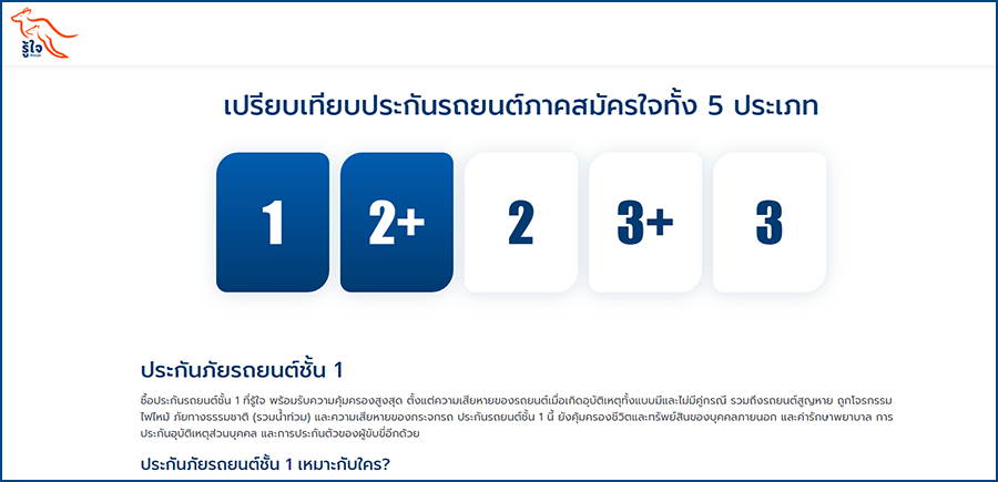 ตัวอย่าง หน้าเว็บไซต์ประกันภัยรู้ใจ ที่มีประกันภัยภาคสมัครใจแบบรายปีให้เลือกเปรียบเทียบครบทั้ง 5 ประเภท
