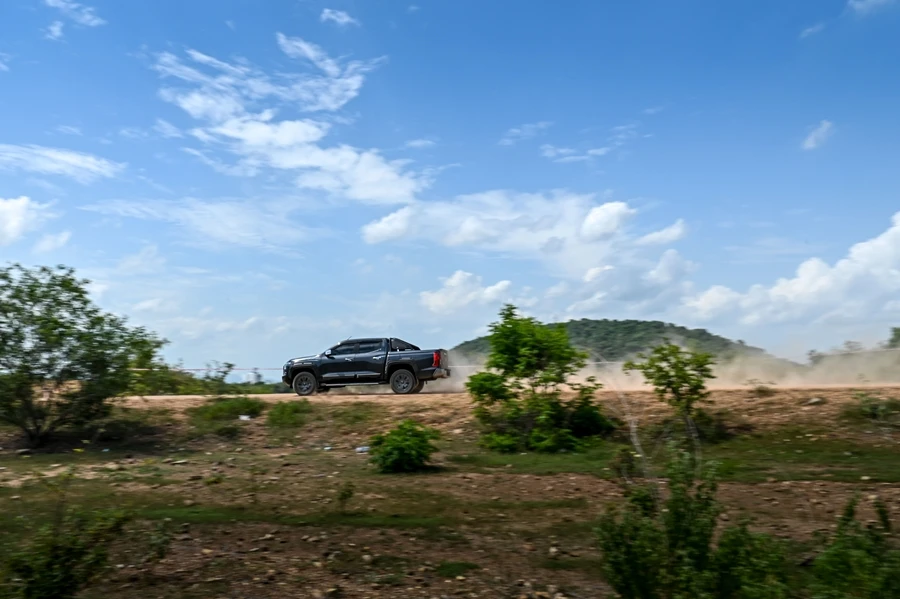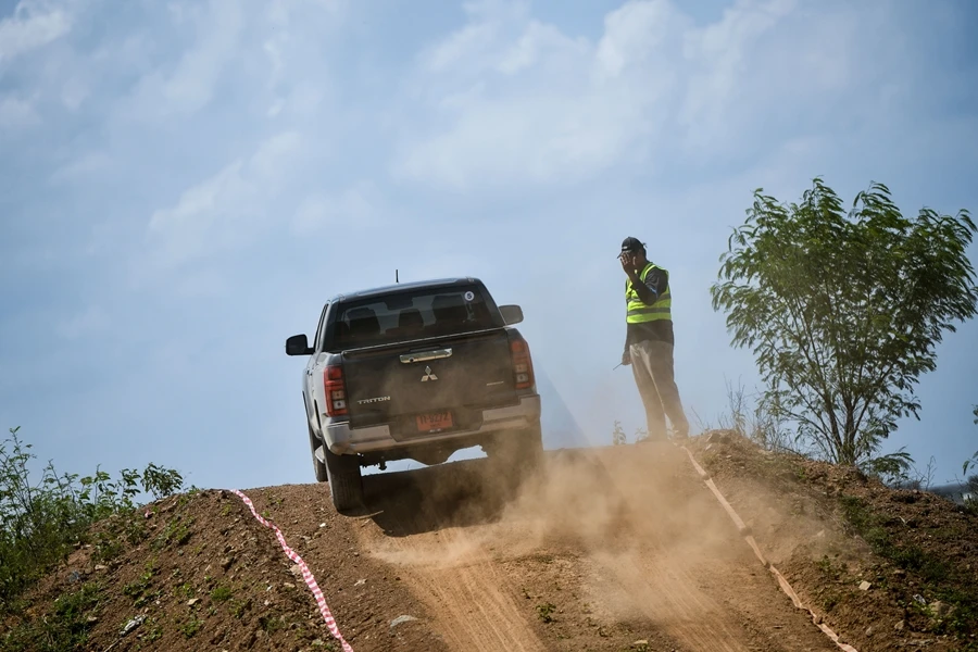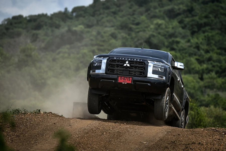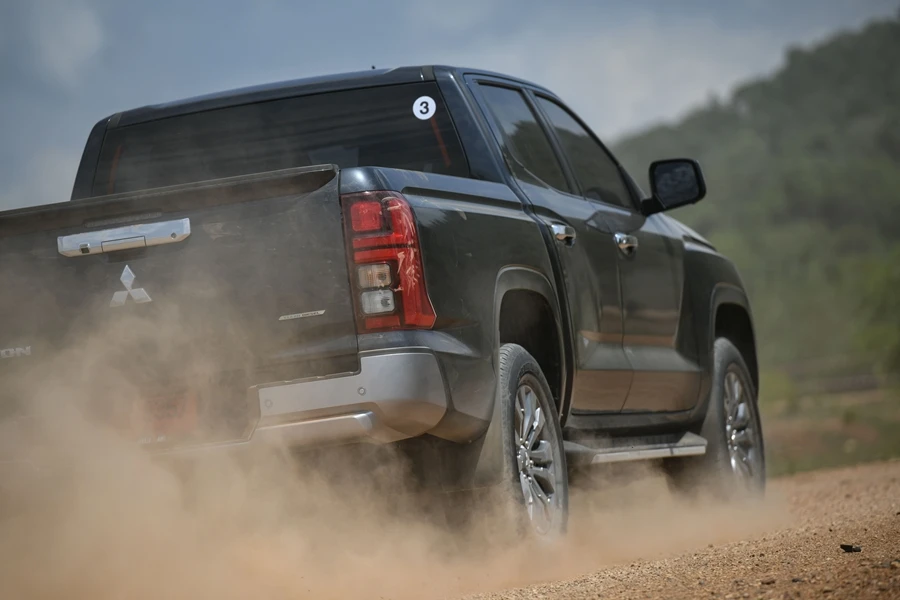 การทำงานของช่วงล่างที่ยุบยึดในระดับที่กำลังพอเหมาะลงตัวตัวรถไม่มีอาการสั่นสะท้านมากเหมือนรถกระบะบางยี่ห้อ ในช่วงบ่ายขบวนทดสอบออล นิว ไทรทัน ไปทำการทดสอบการขับทางฝุ่นกันที่ค่ายอดิศร ที่มีการทำแทร็คจัดวางเส้นทางไว้ระยะทางประมาณ 2 กม. เส้นทางยกระดับขึ้นมาจากพื้นดิน ทำให้ต้องขับระวังเป็นพิเศษไม่ว่าการใช้ความเร็วที่เหมาะสม การเบรก และเข้าโค้ง เพราะยังอยู่บนพื้นฐานรถกระบะขับเคลื่อน 2 ล้อ ยกสูง แต่หลังจากได้ลองขับสั้นเพียง 2 รอบ จับอาการของช่วงล่างและการถ่ายกำลังก็เป็นไปตามความเร็วระหว่าง 20-60 กม./ชม. ซึ่งตัวรถขับผ่านไปได้โดยไม่มีอะไรให้กังวล ซึ่งยี่ห้อไหนก็ทำได้เช่นกัน แต่รายละเอียดนิดหน่อยที่แตกต่างจากที่เคยขับมาคงให้น้ำหนักไปที่การดูดซับแรงสะเทือนจากพื้นผิวที่ให้ความสบายกว่าตั้งแต่ขับบนถนนทางเรียบ