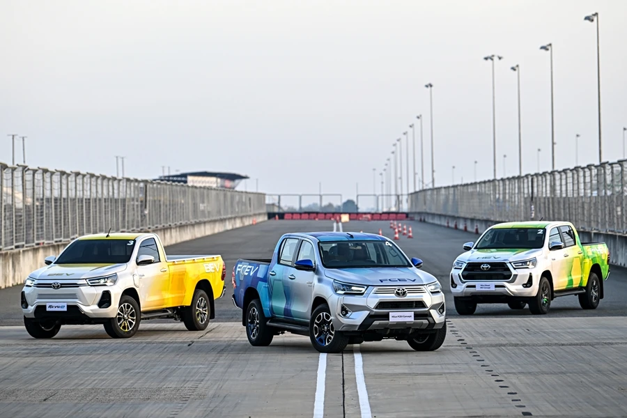 รถกระบะโตโยต้า ไฮลักซ์ ที่นำมาแสดงและให้สื่อฯ บางส่วนลองขับกันนั้นมีทั้งหมด 3 แบบ 3 พลังงานขับเคลื่อนที่แตกต่างกัน