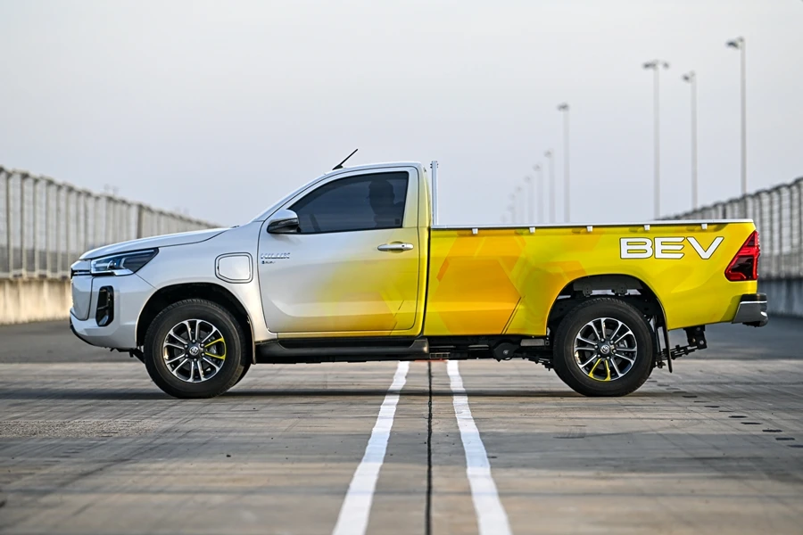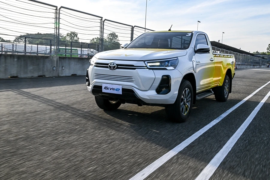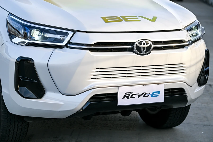 คันแรกรุ่น HIlux Revo e เป็นการนำกระบะหัวเดี่ยวตอนเดียวมาปรับเปลี่ยนให้ขับเคลื่อนด้วยมอเตอร์ไฟฟ้า 100% ระยะทางที่วิ่งได้ต่อการเติมเชื้อเพลิง 1 ครั้งเคลมไว้ที่ 300 กม. แต่ไม่รองรับการบรรทุกหนัก