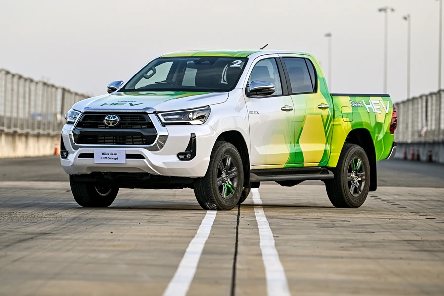 คันสุดท้ายรุ่น Hilux Diesel HEV concept เป็นการนำกระบะ 4 ประตูมาปรับเปลี่ยนขุมพลังขับเคลื่อนด้วยเครื่องยนต์ดีเซลไฮบริดที่ใช้เชื้อเพลิงไบโอดีเซล ผสานการทำงานกับระบบไฮบริด (HEV) ทำระยะทางวิ่งได้ต่อการเติมเชื้อเพลิง 1 ครั้งได้ไกลมากถึง 1,200 กม. และยังสามารถรองรับการบรรทุกได้มากถึง 3,500 กก. !