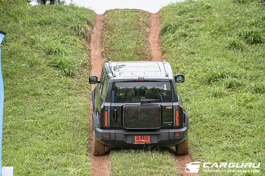 JAECOO 6 EV Long Range 4WD โดดเด่นเรื่องรูปทรงกล่อง ตัวถังอลูมิเนียมลดน้ำหนักตัวลงกว่า 30% ใต่ท้องสูงพอตัวขับผ่านเนินชันเนินสลับสบาย ๆ ส่วนหัวและท้ายสั้น หมดห่วงเรื่องมุมปีนและมุมจากเวลาเข้าป่า ระบบช่วยเหลือการขับขี่ในทางออฟโร้ดทำงานได้ดี มั่นใจในเทคโนโลยีเดียวกับใน Off Road Premium RandRover ลุยได้สบาย พละกำลังมอเตอร์ไฟฟ้าแรงบิดดี มาเต็ม ไม่รอรอบ ทำให้การขับขี่ผ่านเนินหรือทางชันง่ายไม่ต้องลุ้น แต่ก็มีข้อควรระวัง เนื่องจากเป็นระบบมอเตอร์ไฟฟ้าที่มีแรงบิดสูงและไม่รอรอบ เหยียบปุ๊ปมาปั๊ป ผู้ขับต้องกะน้ำหนักเท้าให้พอดีกับกำลังที่ใช้ในการขับผ่านอุปสรรคนั้น ๆ หากกดคันเร่งมากไปอาจะทำให้ล้อหมุนหรือรถเคลื่อนที่เร็วเกินไป แต่...!!! ไม่ต้องกลัวถ้าใช้งานในโหมดออฟโร้ดต่าง ๆ ของรถ ก็จะช่วยปลอดภัยมากขึ้น