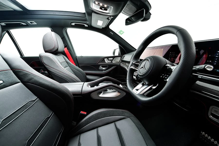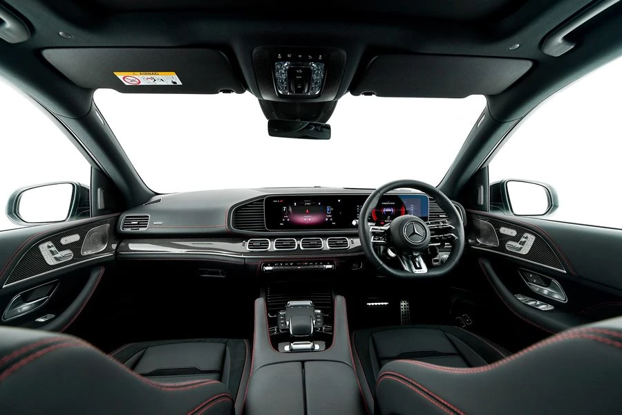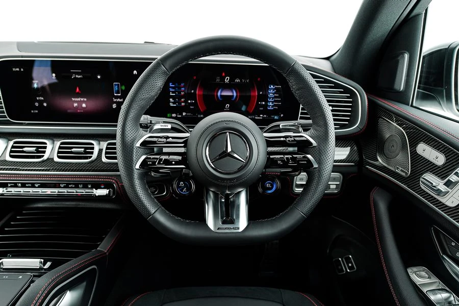 ภายในห้องโดยสารของ Mercedes-AMG GLE 53 HYBRID 4MATIC+ มาพร้อม AMG Interior Package มอบรายละเอียดการตกแต่งที่โดดเด่นตามสไตล์สปอร์ตในทุกองค์ประกอบ ไม่ว่าจะเป็น พวงมาลัย AMG Performance steering wheel พร้อมระบบพวงมาลัย AMG Steering 3 สเตจ ติดตั้งเบาะนั่งหุ้มด้วยหนังและไมโครไฟเบอร์ หลังคากระจก Panoramic Sunroof ที่ช่วยเพิ่มความโปร่งสบายให้กับห้องโดยสาร