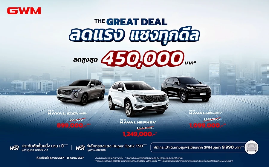 GWM HAVAL JOLION Sport มาพร้อมส่วนลดเงินสดมูลค่าสูงสุด 40,000 บาท หรือ ดอกเบี้ยพิเศษ 0% หรือดอกเบี้ย 2.15% พร้อมช่วยผ่อนมูลค่า 24,000 บาท พร้อมฟิล์มกรองแสงและฝาท้ายไฟฟ้า