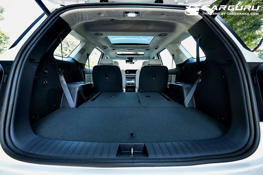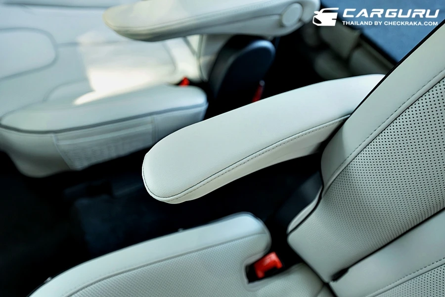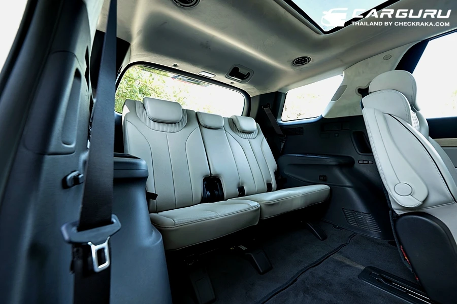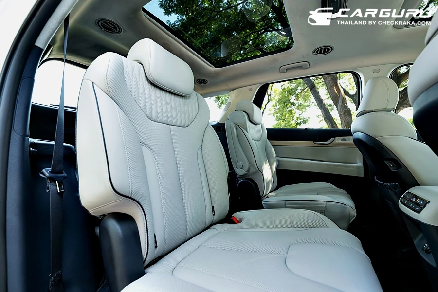 ตำแหน่งเบาะแถวสามนั้นพอนั่งได้แต่พื้นยกสูงมากทำให้เข่าลอยหรือว่นั่งได้ไม่เต็มเบาะ และส่วนพนักพิงสั่น หมอนรองคอต้องดึงขึ้นให้ตรงส่วนหัวจึงจะนั่งได้พอดี แต่ข้อดีคือ รถมีช่วงล่างที่ให้ความ "เฟิร์ม" หนึบแน่นไม่กระเด้ง ทำให้ไม่มีอาการมึนหรือเมาและไม่กระแทกหรือถูกโยนแรง ๆ เมื่อขึ้นคอสะพานอีกด้วย ส่วนความสะดวกสบายเบาะแถวสามยังคงให้ USB-C ที่วางแก้วน้ำ ช่องแอร์บนเพดานมาให้แบบไม่น้อยหน้าแถวอื่น ๆ เลยครับ