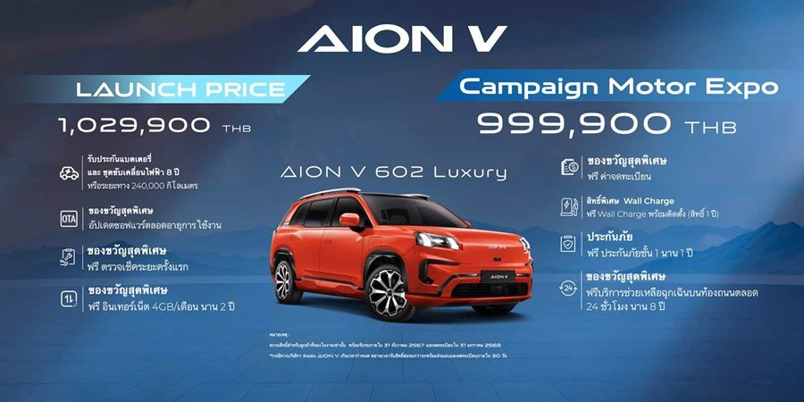 AION V 602 Luxury ราคาจำหน่ายอย่างเป็นทางการ 1,029,900 บาท โปรโมชั่นพิเศษสำหรับ AION V เฉพาะในงาน Motor Expo 2024 ระหว่างวันที่ 28 พฤศจิกายน ถึงวันที่ 10 ธันวาคม 2567 รับสิทธิพิเศษ ส่วนลดเพิ่ม 30,000 บาท ราคาเหลือเพียง 999,900 บาท