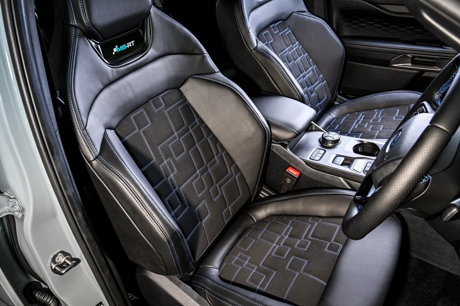 เบาะดีไซน์เฉพาะให้รองรับสรีระขณะขับความเร็วสูง หุ้มด้วยหนังสลับกับ หนัง Alcantara ที่ถูกตัดเย็บเป็นพิเศษ พร้อมเดินด้ายสีฟ้า เป็นเอกลักษณ์เฉพาะ MS-RT สีนํ้าเงินตกแต่งรอบห้องโดยสาร และสัญลักษณ์ MS-RT บนเบาะคู่หน้า เบาะนั่งผู้โดยสารตอนหลัง และแผงคันเกียร์