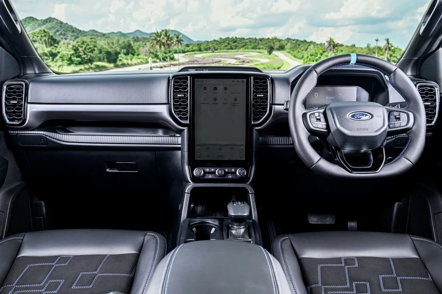 พวงมาลัยสปอร์ตดีไซน์ใหม่ ตกแต่งด้วยแถบสีน้ำเงินที่ตำแหน่ง 12 นาฬิกาหน้าจอแสดงผลแบบสัมผัส Multi-Touch ขนาด 12 นิ้ว