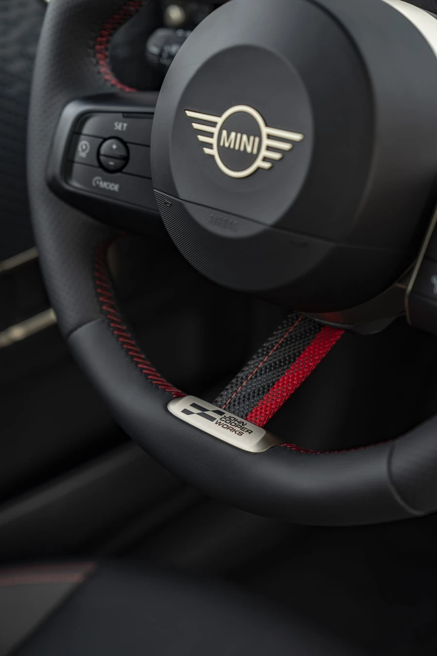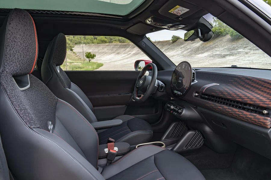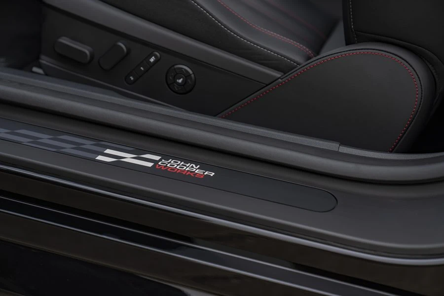 ภายในห้องโดยสาร ยังเต็มไปด้วยโทนสีแดงและดำอันเป็นเอกลักษณ์ของจอห์น คูเปอร์ เวิร์คส์ ทั้งพวงมาลัยสปอร์ต JCW สีดำที่ประดับด้วยตะเข็บสีแดงและหุ้มผ้าที่ตำแหน่ง 6 นาฬิกาเพื่อให้จับถนัดมือ เบาะสปอร์ต JCW ให้การรองรับที่มั่นคงระหว่างการขับขี่แบบสุดตัว ตกแต่งด้วยตะเข็บสีแดงตัดกับหนังเทียมสีดำเช่นเดียวกับผิวหน้าของคอนโซล นอกจากนี้ ระบบ MINI Experience Modes ในรุ่นนี้ ยังมีโหมด Go-Kart ที่เพิ่มเข้ามาสำหรับรถยนต์ตระกูล JCW โดยเฉพาะเพื่อเติมกลิ่นอายของมอเตอร์สปอร์ตให้เข้มข้นยิ่งขึ้น โดยโหมดนี้จะตั้งค่าพวงมาลัยให้ไวมากขึ้น คันเร่งตอบสนองเร็วขึ้น และแสดงข้อมูลเพิ่มเติมบนหน้าจอ OLED ทรงกลมด้านหน้า ทั้งแรงบิด กำลังเครื่องยนต์ และแรง G แบบเรียลไทม์