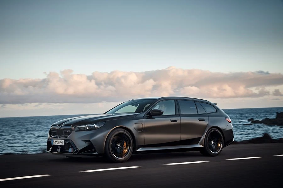 M5 Touring ใหม่ สรรสร้างมาในทุกรายละเอียดเพื่อการขับขี่ทุกรูปแบบ ตอบโจทย์ทั้งการเดินทางในชีวิตประจำวันและทริปเดินทางไกล ทั้งยังพร้อมมอบสมรรถนะที่เป็นเลิศควบคู่กับทางเลือกในการขับขี่แบบไฟฟ้าล้วน คุณสมบัติทั้งหมดนี้รวบรวมไว้ภายใต้งานออกแบบที่ได้รับแรงบันดาลใจจากรถแข่งพันธุ์แท้ โดยรูปทรงของตัวถังด้านข้างผ่านการปรับแต่งให้เป็นเอกลักษณ์ประจำตัว ไม่ว่าจะเป็นซุ้มล้อที่นูนเด่นหรือเส้นหลังคาที่ทอดยาวไปด้านท้าย ส่วนด้านหน้ารถ แสดงคาแรกเตอร์ความแรงเต็มที่ด้วยช่องรับลมขนาดใหญ่ กระจังหน้าไตคู่แบบ M พร้อมไฟส่องสว่าง BMW Iconic Glow ขณะที่ท้ายรถประดับด้วยแถบไฟท้ายที่โค้งรับกับทุกสัดส่วน ตั้งอยู่เหนือดิฟฟิวเซอร์คู่และชุดท่อไอเสีย 4 ท่อที่ยิ่งขับเน้นความสง่างามและน่าเกรงขามให้ชัดเจน และยังสามารถจุสัมภาระได้สูงสุดถึง 1,630 ลิตร
