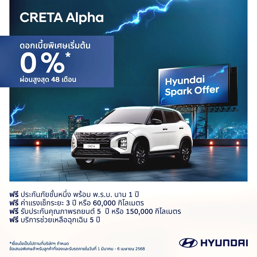พร้อมสิทธิประโยชน์ทางการเงิน เลือกรับส่วนลดเงินสด 20,000 บาท หรือบัตรของขวัญ Central Magic Gift Card 20,000 บาท พร้อมดอกเบี้ยพิเศษ 1.99% (ปลายงวด) ดาวน์ 25% และผ่อนสูงสุด 48 เดือน พิเศษ! รับ Digital Car Key ฟรี สำหรับทุกรุ่นย่อย พร้อมแพ็กเกจ Hyundai Smart Care ครอบคลุมค่าบำรุงรักษา 4 ปี หรือ 40,000 กม. การรับประกันคุณภาพรถยนต์ 7 ปี หรือ 150,000 กม. และบริการช่วยเหลือฉุกเฉิน 7 ปี ไม่จำกัดระยะทาง