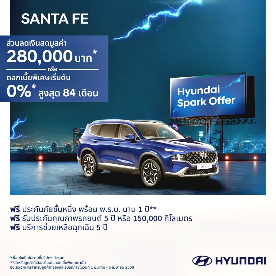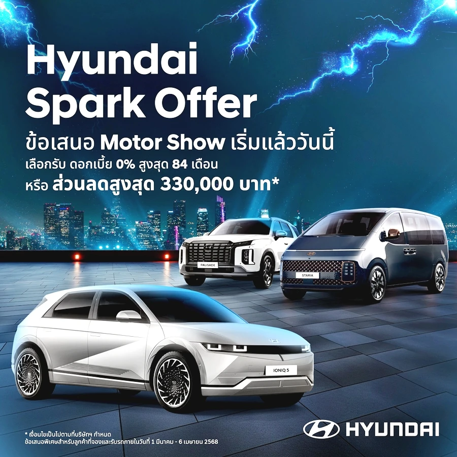 ใครเล็งรถยนต์ฮุนไดไว้ ตอนนี้โอกาศดี "HYUNDAI SPARK OFFER" ให้คุณเป็นเจ้าของนวัตกรรมแห่งอนาคตได้ง่ายขึ้นด้วยส่วนลดสูงสุดถึง 330,000 บาท หรือเลือกดอกเบี้ย 0% ผ่อนสบายๆ นานสูงสุด 84 เดือน พิเศษ! เฉพาะลูกค้าที่จองและรับรถในงาน MOTOR SHOW 2025 ระหว่างวันที่ 1 มีนาคม - 6 เมษายน 2568 เท่านั้น