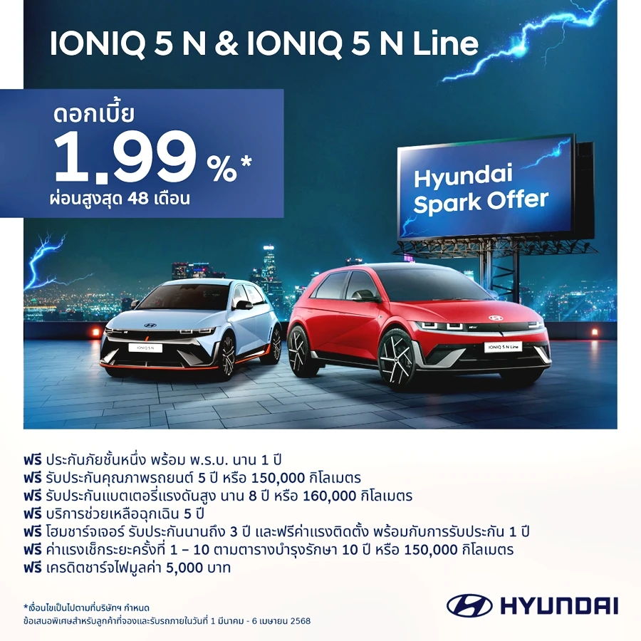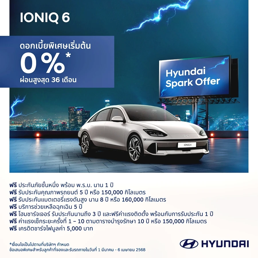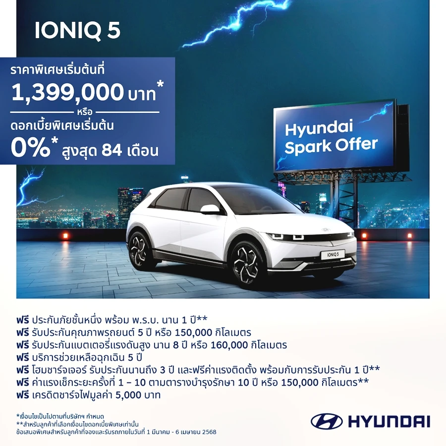 สิทธิพิเศษ ที่เหนือกว่าและคุ้มค่าสูงสุด! ลูกค้า IONIQ ที่เลือกเงื่อนไขผ่อน 0% ในงาน MOTOR SHOW 2025 จะได้รับแพ็กเกจประกันคุณภาพรถยนต์ 5 ปี หรือ 150,000 กม. และประกันแบตเตอรี่แรงดันสูง 8 ปี หรือ 160,000 กม.พร้อมบริการช่วยเหลือฉุกเฉิน 5 ปี ไม่จำกัดระยะทาง และฟรีค่าแรงเช็กระยะ 10 ครั้ง ภายใน 10 ปี หรือ 150,000 กม. (แล้วแต่อย่างใดอย่างหนึ่งถึงก่อน)