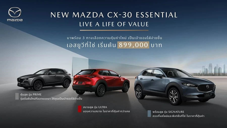 มาสด้า เผยโฉมอีกหนึ่งยนตรกรรมภายใต้ ESSENTIAL COLLECTION ครอสโอเวอร์เอสยูวีสปอร์ตพรีเมี่ยม NEW MAZDA CX-30 ESSENTIAL ภายใต้แนวคิด LIVE A LIFE OF VALUE เติมเต็มชีวิตให้คุ้มค่ากับเอสยูวีที่ใช่ ตอบโจทย์ทุกความต้องการ สง่างามด้วย โคโดะ ดีไซน์ ที่ออกแบบภายใต้คอนเซ็ปต์ Less is More เรียบง่ายแต่งดงาม คงไว้ซึ่งความโฉบเฉี่ยวและทรงพลัง มาพร้อมระบบควบคุมสมรรถนะการขับขี่อัจฉริยะขั้นสูง GVC Plus เหนือระดับด้วยเครื่องยนต์สกายแอคทีฟเบนซิน 2.0 ลิตร ทั้งแรงและประหยัดน้ำมัน ตอบสนองดีที่สุดให้กำลังสูงสุด 165 แรงม้า สัมผัสประสบการณ์ใหม่แห่งการควบคุมการขับขี่ที่แม่นยำและสมดุล ด้วยสกายแอคทีฟแพลตฟอร์มเจเนอเรชั่นใหม่ อัดแน่นด้วยเทคโนโลยีความปลอดภัยรอบคัน ราคาจำหน่ายเริ่มต้นเพียง 899,000 บาท ดอกเบี้ย 2.49%1 ฟรีประกันภัยชั้นหนึ่ง Mazda Premium Insurance 1 ปี2 พิเศษสุด ลูกค้า Mazda Family รับฟรีบัตรน้ำมันมูลค่า 20,000 บาท สนใจสอบถามข้อมูลเพิ่มเติมได้ที่โชว์รูมมาสด้าทั่วประเทศ หรือเว็บไซต์ www.mazda.co.th