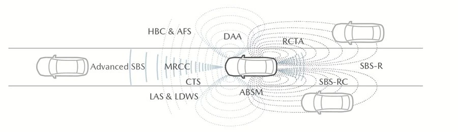 - ระบบเตือนเมื่อมีรถในจุดอับสายตาขณะเปลี่ยนเลน ABSM (Advanced Blind Spot Monitoring)