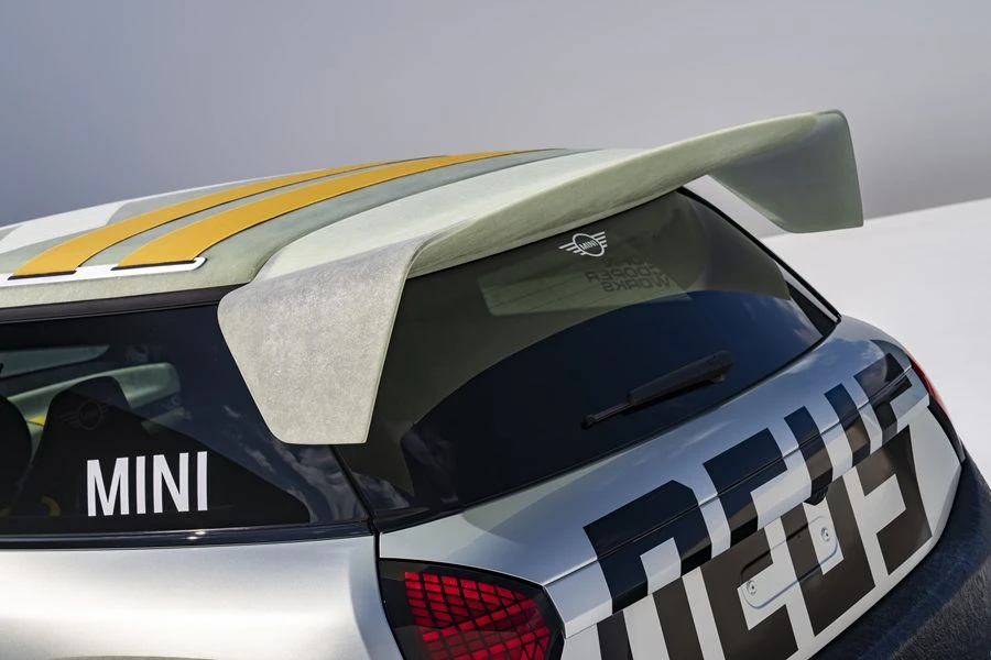 ตัวถังรถสร้างความประทับใจแรกพบที่ด้วยสีเหลืองสดใสและสีเงิน ที่สะท้อนถึงแนวคิดการพัฒนายานยนต์ไฟฟ้าของ MINI ด้วยบังโคลนหน้ากว้าง, กระจังหน้าเรืองแสง และสปอยเลอร์หลังคาช่วยเสริมให้รูปลักษณ์โฉบเฉี่ยวยิ่งขึ้น ขณะที่แผงไฟเบอร์กลาสกึ่งโปร่งแสงช่วยลดน้ำหนักตัวรถลง 15% และเสริมประสิทธิภาพด้านอากาศพลศาสตร์ ส่วนสปอยเลอร์หลัง Flex Tip Surf ตอบสนองต่อการไหลเวียนของอากาศคล้ายกับกระดานโต้คลื่นที่แล่นไปตามรูปทรงของคลื่น สายรัดที่ยึดไว้บนหลังคาเป็นสัญลักษณ์ของการผูกกระดานโต้คลื่นหลังจากเล่นเซิร์ฟ แต่ยังคงเป็นรายละเอียดการออกแบบที่เป็นเอกลักษณ์ของตระกูล MINI