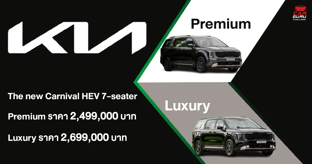 The new Kia Carnival HEV 7-seat Premium ราคา 2,499,000 บาท มาพร้อมการรับประกันคุณภาพนาน 7 ปี บริการช่วยเหลือฉุกเฉิน ฟรี 24 ชม. 7 ปี ไม่จำกัดระยะทาง การรับประกันแบตเตอรีรถยนต์ (High-Voltage Battery) นาน 8 ปี และข้อเสนอพิเศษช่วงเปิดตัว ฟรี ค่าบำรุงรักษาตามระยะ (ค่าแรง และค่าอะไหล่) ตลอด 3 ปี หรือ 30,000 กิโลเมตร พิเศษ! สำหรับเจ้าของรถยนต์เกียและครอบครัว (Kia Loyalty) รับสิทธิ์ฟรี! ค่าบำรุงรักษาตามระยะ (ค่าแรง และค่าอะไหล่) เพิ่มอีก 2 ปี หรือ 20,000 กิโลเมตร รวมเป็น 5 ปี หรือ 50,000 กิโลเมตร ตั้งแต่วันที่ 3 ถึง 31 ตุลาคม 2568 โดย เกีย เซลส์ (ประเทศไทย) พร้อมส่งมอบรถ และเปิดให้ทดลองขับ ณ โชว์รูมเกียทุกสาขาทั่วประเทศ ได้ตั้งแต่วันที่ 3 ตุลาคม 2568 เป็นต้นไป