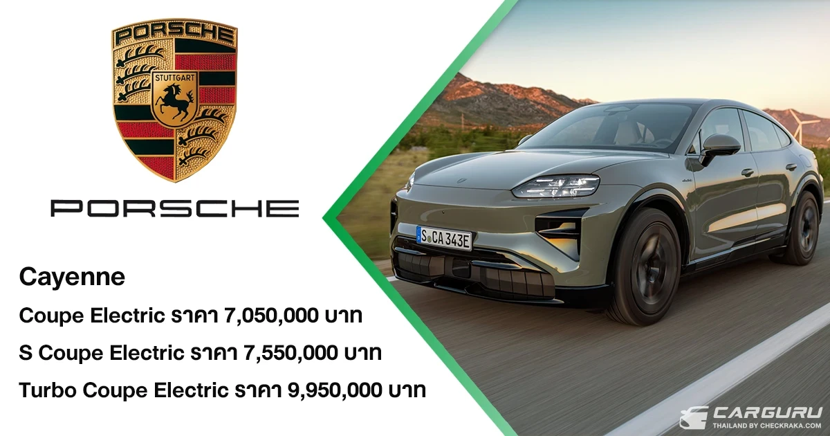 - คาเยนน์ คูเป้ อิเล็กทริค (Cayenne Coupé Electric) ให้พละกำลัง 300 กิโลวัตต์ (408 แรงม้า) พร้อมกำลังโอเวอร์บูสต์ในโหมด Launch Control ที่ 325 กิโลวัตต์ (442 แรงม้า) อัตราเร่ง 0–100 กม./ชม. ใน 4.8 วินาที ความเร็วสูงสุด 230 กม./ชม. ราคาจำหน่ายเริ่มต้นที่ 7,050,000 บาท