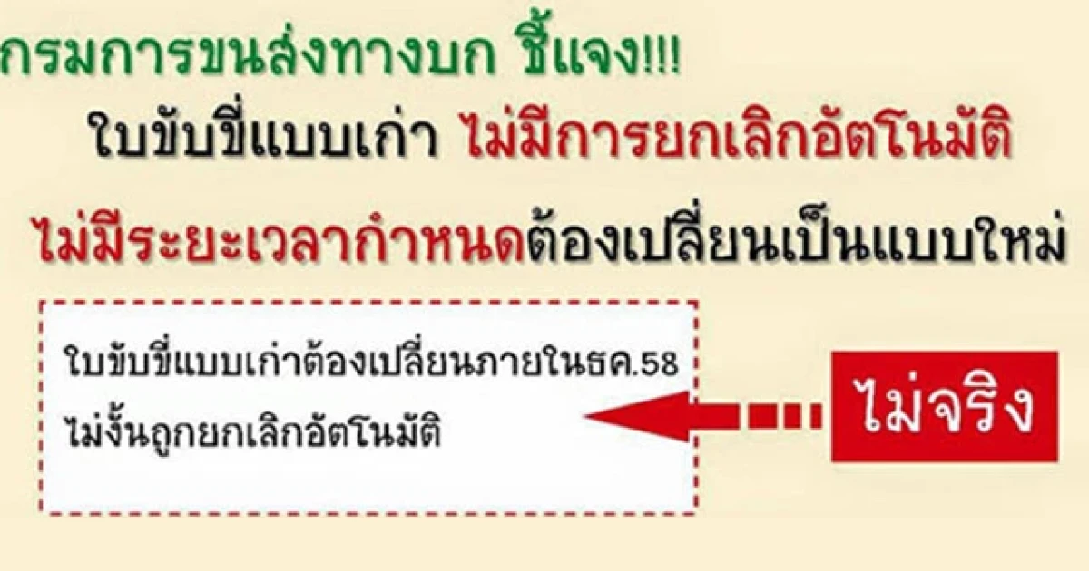 กรมการขนส่งทางบกชี้แจง ไม่มีการยกเลิกใบขับขี่ตลอดชีพแบบเก่า กรณีที่มีข่าวหรือแชร์กันในกระแสโซเชียลเน็ตเวิร์คนั้นว่าไม่เป็นความจริง ดังนั้นใบขับขี่ตลอดชีพยังคงใช้ได้ตลอด และหากต้องการเปลี่ยนบัตรเป็นรุ่นใหม่ สามารถเข้ารับบริการเปลี่ยนได้ทันที