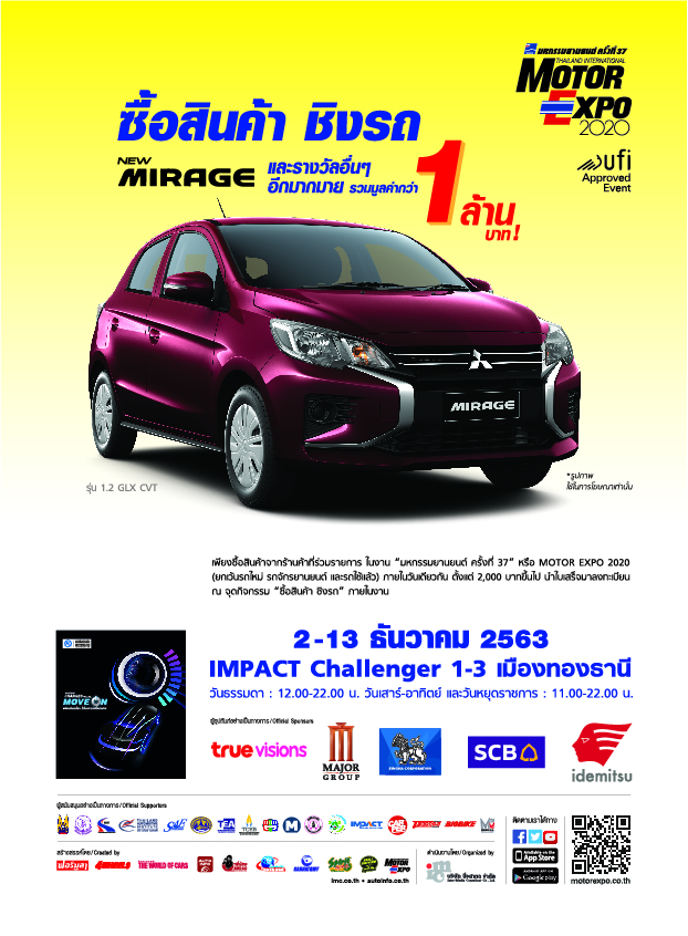 "มหกรรมยานยนต์ ครั้งที่ 37" จัดขึ้น ณ อาคารชาลเลนเจอร์ IMPACT เมืองทองธานี ระหว่างวันที่ 2-13 ธันวาคม 2563 ติดตามรายละเอียดเพิ่มเติมได้ที่