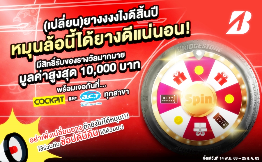 บริดจสโตน มอบของขวัญทั่วไทย ช่วงเทศกาลปีใหม่ แคมเปญ "SPIN THE LUCKY WHEEL" SPIN THE LUCKY WHEEL (เปลี่ยน) ยางไงดีสิ้นปี หมุนล้อนี้ ได้ยางดีแน่นอน ส่วนลดสูงสุดในรอบปี ที่พลาดไม่ได้!!