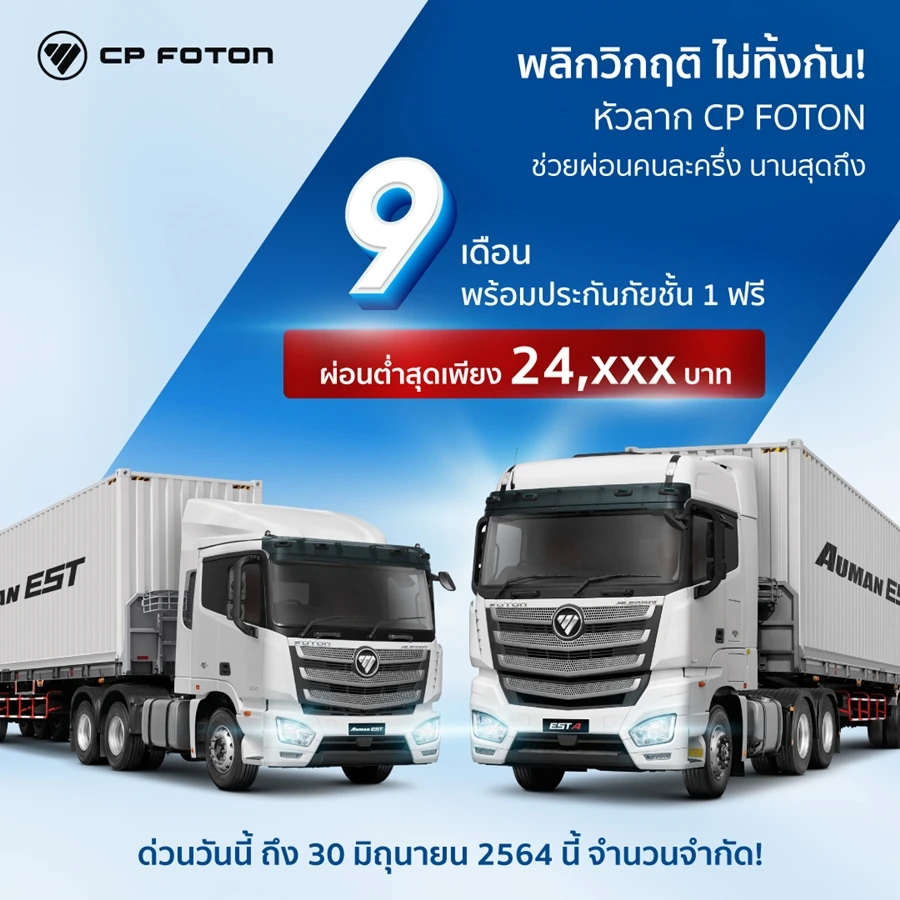 FOTON รถเพื่อการพาณิชย์ โดยบริษัท ซีพี โฟตอน เซลส์ จำกัด ปล่อยแคมเปญ "พลิกวิกฤต ไม่ทิ้งกัน! ช่วยผ่อนคนละครึ่ง นานสูงสุด 24 เดือน พร้อมประกันภัยชั้น 1 ฟรี" สำหรับรถบรรทุก และรถบัส ซีพี โฟตอน ตั้งแต่วันนี้ถึง 30 มิถุนายน 2564 เพื่อช่วยเหลือลูกค้าหรือผู้ประกอบการที่ได้รับผลกระทบจากโรคระบาดโควิด-19 ให้สามารถออกรถไปทำเงินได้อย่างสบายใจ