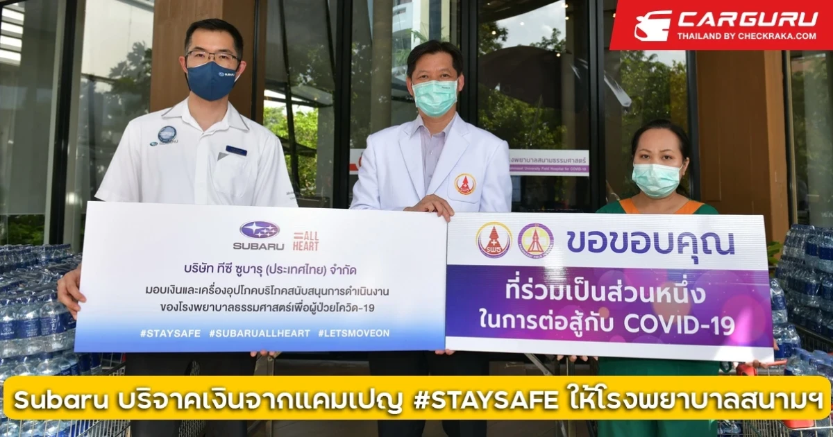 บริษัท ทีซี ซูบารุ (ประเทศไทย) จำกัด เป็นตัวแทนครอบครัวซูบารุมอบเงินจากกิจกรรม #STAYSAFE เพื่อเป็นกำลังใจและสนับสนุนการทำงานของบุคลากรทางการแพทย์ โดยกิจกรรม #STAYSAFE เป็นกิจกรรมออนไลน์ที่เปิดโอกาสให้คนไทยได้ส่งกำลังใจผ่านข้อความแคปชั่นและกรอบรูปเฟซบุ๊คในระหว่างวันที่ 13 พฤษภาคม – 25 มิถุนายน ที่ผ่านมา และได้รับเสียงตอบรับอย่างล้นหลามทำให้สามารถ รวบรวมเงินบริจาคสูงสุด 70,000 บาท ในการสนับสนุนการทำงานของแพทย์และบุคลากรทางการแพทย์ของโรงพยาบาลธรรมศาตร์ที่ยังคงดูแลผู้ป่วยโควิด-19 อย่างต่อเนื่อง