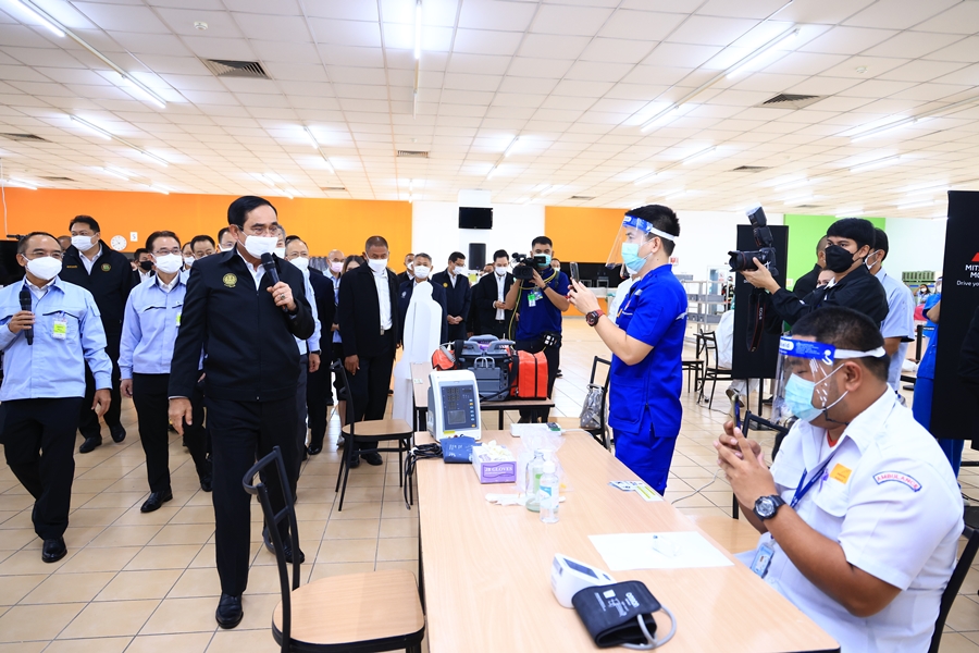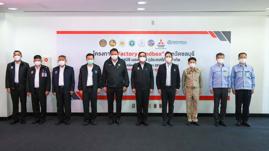 พลเอก ประยุทธ์ จันทร์โอชา นายกรัฐมนตรี พร้อมด้วย นายสุชาติ ชมกลิ่น รัฐมนตรีว่าการกระทรวงแรงงาน, นายอิทธิพล คุณปลื้ม รัฐมนตรีว่าการกระทรวงวัฒนธรรม, นายสุรชัย ชัยตระกูลทอง ผู้ช่วยรัฐมนตรีประจำกระทรวงแรงงาน, คุณสุทธิ สุโกศล ปลัดกระทรวงแรงงาน และคุณภัครธรณ์ เทียนไชย ผู้ว่าราชการจังหวัดชลบุรี และคณะ เข้าตรวจเยี่ยมและรับฟังการรายงานผลความคืบหน้าโครงการ Factory Sandbox พร้อมเยี่ยมเดินชมกิจกรรมการฉีดวัคซีนกลุ่มพนักงาน ณ ศูนย์การผลิตรถยนต์มิตซูบิชิ มอเตอร์ส ประเทศไทย นิคมอุตสาหกรรมแหลมฉบัง จังหวัดชลบุรี โดยมี มร. โมะริคาซุ ชกกิ ประธานคณะกรรมการบริษัท มิตซูบิชิ มอเตอร์ส (ประเทศไทย) จำกัด พร้อมคณะผู้บริหารให้การต้อนรับ
