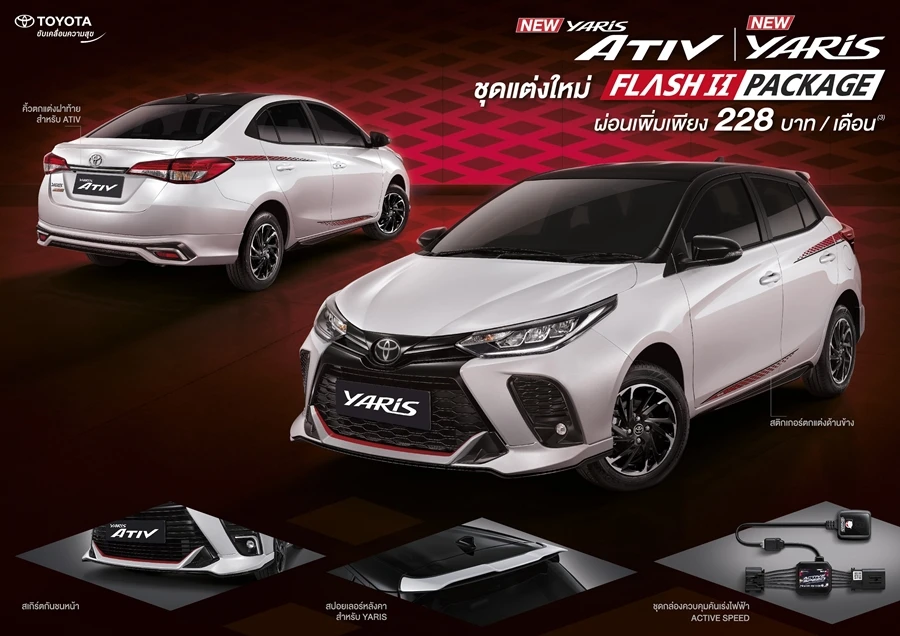 นายสุรศักดิ์ กล่าวเพิ่มเติมว่า นอกจากนี้ผมขอแนะนำอีกหนึ่งทางเลือกให้กับลูกค้าผู้ชื่นชอบดีไซน์สปอร์ตด้วยชุดตกแต่งพิเศษ FLASH II PACKAGE ที่เสริมความโฉบเฉี่ยวและดูโดดเด่นสะดุดตาให้กับ YARIS และ ATIV มากยิ่งขึ้น และที่สำคัญยังมีกล่องควบคุมคันเร่งไฟฟ้า ACTIVE SPEED เติมความสปอร์ต ตอบสนองรวดเร็วในขณะออกตัว เพิ่มความสนุกสนานในการขับขี่ โดยลูกค้าจ่ายเพิ่มเพียงเดือนละ 228 บาทต่อเดือนในยอดการผ่อนชำระรายเดือนเท่านั้น (คำนวณจากโปรแกรมเช่าซื้อปกติ ATIV รุ่น ENTRY ดาวน์ 25% ระยะเวลา 84 เดือน ผ่านบริษัท โตโยต้า ลีซซิ่ง (ประเทศไทย) จำกัด อ้างอิงดอกเบี้ย ณ เดือนกันยายน 2564)