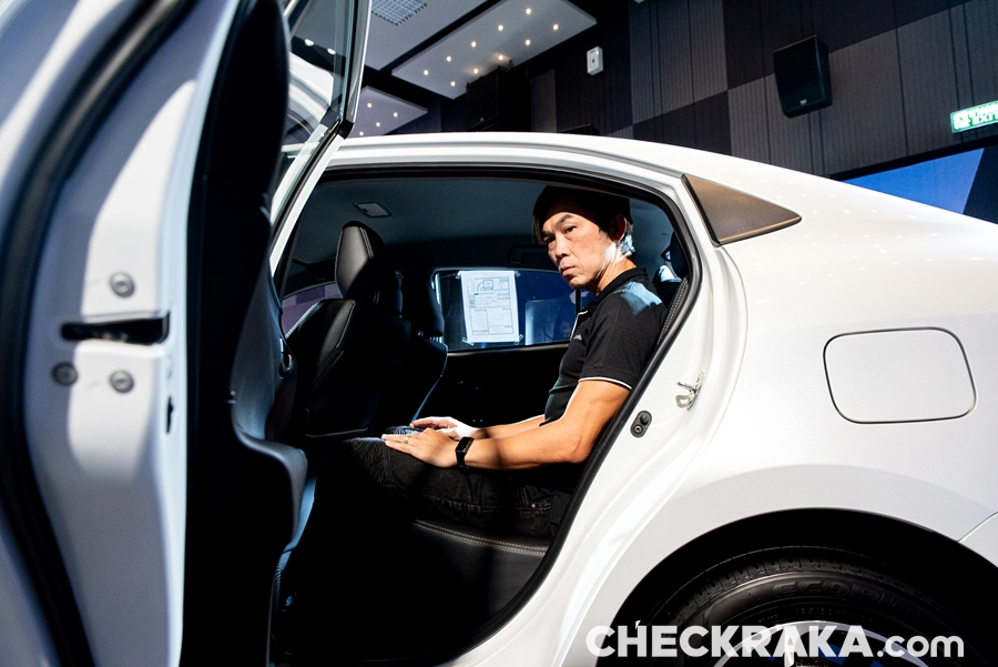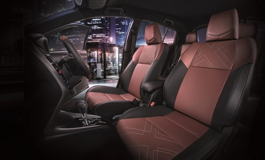 ส่วนภายใน เบาะนั่งด้านหน้าและหลังสีทูโทนแดง Terra Rossa และสีดำ พร้อมเดินด้ายลายพิเศษ, พวงมาลัยหุ้มหนังนุ่มพิเศษสีทูโทนแดง Terra Rossa และสีดำ ตกแต่งด้วยด้ายสีเทา, ที่วางแขนบริเวณแผงประตูตกแต่งด้วยด้ายสีเทา และ กล่องเก็บของที่คอนโซลกลางตกแต่งด้วยด้ายสีเทา