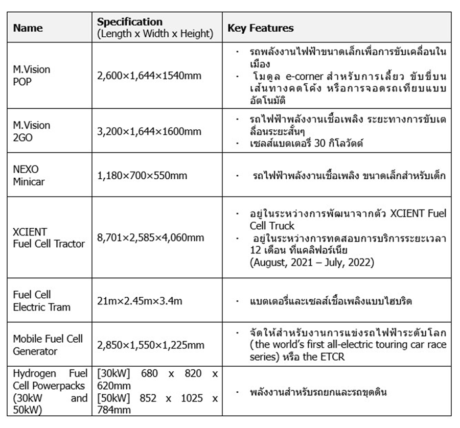 และ XCIENT Fuel Cell รถบรรทุกไฟฟ้าเซลเชื้อเพลิงเพื่อการพาณิชย์ขนาดใหญ่รุ่นแรกของโลกในปี 2020. กลุ่มบริษัทเชื่อว่าพลังงานไฮโดรเจนจะเป็นส่วนสำคัญในการสร้างสังคมแห่งความยั่งยืนในอนาคต และจะช่วยลดความจำเป็นในการใช้พลังงานเชื้อเพลิงฟอสซิล และกว่า 2 ทศวรรตของการเป็นแนวหน้าในการพัฒนาเทคโนโลยีเซลส์เชื้อเพลิง กลุ่มบริษัทฮุนได มอเตอร์ กรุ๊ป จะขยายการใช้เทคโนโลยีเซลส์เชื้อเพลิงนี้ไปสู่การใช้งานในรูปแบบต่างๆที่กว้างขึ้น ไม่ว่าจะเป็นโซลูชันแห่งการขับเคลื่อน (Mobility Solution) ในรูปแบบต่างๆ รวมถึงการใช้งานพลังงานในรูปแบบอื่นๆ อ้างอิงจาก Hydrogen Council ซึ่งเป็นโครงการที่ริเริ่มโดยผู้บริหารของบริษัทด้านพลังงาน การขนส่ง อุตสาหกรรม และ การลงทุนระดับโลกนั้น ความต้องการของพลังงานไฮโดรเจนจะคิดเป็น 18% ของความต้องการด้านพลังงานระดับโลกภายในปี 2050 ด้วยมูลค่าตลาดกว่า 2.5 ล้านล้านดอลลาร์สหรัฐ ความนิยมของพลังงานไฮโดรเจนจะช่วยลดการปล่อยก๊าซคาร์บอนไดออกไซด์กว่า 6 พันลานตันในแต่ละปี และช่วยสร้างงานในตลาดแรงงานกว่า 30 ล้านตำแหน่ง