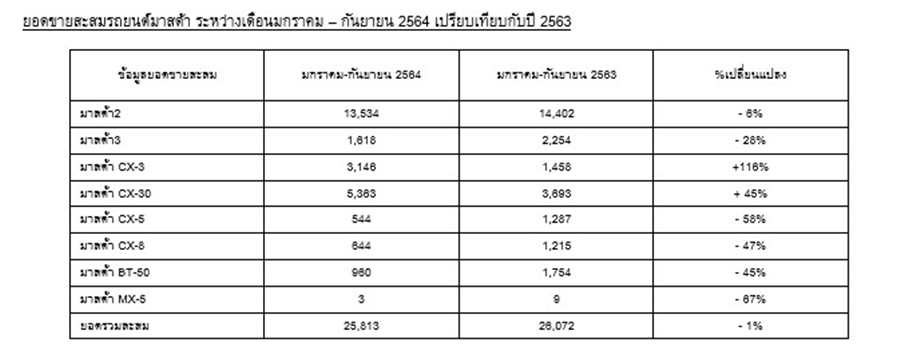 ในขณะที่ยอดขายสะสมตั้งแต่เดือนมกราคมถึงเดือนกันยายน 2564 มีจำนวนทั้งสิ้น 25,813 คัน ลดลงเล็กน้อยเพียง 1% โดยแบ่งออกเป็นรถอเนกประสงค์ตระกูล CX-Series จำนวน 9,698 คัน หรือเติบโตเพิ่มขึ้นถึง 27% ในขณะที่รถยนต์นั่งมียอดขายรวมที่ 15,155 คัน ลดลงเล็กน้อยเพียง 9% ส่วนรถปิกอัพ Mazda BT-50 เริ่มกลับมาได้รับความนิยมเพิ่มสูงขึ้น มียอดสะสมจำนวน 960 คัน