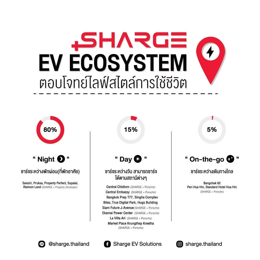 การเปิดสถานีให้บริการร่วมกับพันธมิตรครั้งนี้ นับเป็นก้าวสำคัญที่สนับสนุนให้ SHARGE สามารถเปิดบริการสถานนี้ได้ครอบคลุมลูกค้าทั้ง 3 กลุ่ม (NIGHT-DAY และ ON-THE-GO) ซึ่งสอดคล้องตามแผนธุรกิจ 5 ปีที่วางไว้ ซึ่งการเปิดสถานีในทุกทำเลศักยภาพของ SHARGE นี้เพื่อให้ SHARGE ก้าวไปสู่ผู้ให้บริการธุรกิจชาร์จรถ EV ครบวงจร ซึ่งสถานีของ SHARGE ในหลายทำเลเป็นสถานีที่พัฒนาร่วมกับค่ายรถยนต์ปอร์เช่ (บริษัท เอเอเอส ออโต้ เซอร์วิส จำกัด) ซึ่งการร่วมพัฒนาสถานีของค่ายรถยนต์ชั้นนำนี้ถือเป็นการช่วยสร้างความเชื่อมั่นในมาตรฐานของสถานีชาร์จที่สามารถรองรับการชาร์จสปอร์ตคาร์ของทางปอร์เช่ และค่ายอื่นๆได้เป็นอย่างดี รวมถึงเป็นการการันตีลูกค้าของปอร์เช่ที่จะเข้ามาใช้บริการด้วยเช่นกัน อย่างไรก็ดีการให้บริการหลักยังคงเน้นลูกค้ากลุ่ม NIGHT ที่ต้องการติดตั้งเครื่องชาร์จตามที่พักอาศัย เพราะถือเป็นกลุ่มใหญ่สุดที่จะมีความต้องการชาร์จไฟฟ้า เนื่องจากเป็นการให้บริการที่ตอบโจทย์การใช้ชีวิตประจำวันที่มักจะชาร์จไฟฟ้าขณะที่จอดรถไว้ที่พักอาศัยในช่วงกลางคืน ดังนั้นความร่วมมือในครั้งนี้จึงถือเป็นการสร้างระบบนิเวศเพื่อช่วยกันผลักดันการใช้ EV ของไทยให้เติบโตได้อย่างมีประสิทธิภาพ เพราะการช่วยให้ผู้ใช้ EV เข้าถึงที่ชาร์จได้เพียงพอถือเป็นหัวใจสำคัญของการผลักดันให้ EV เติบโต ซึ่งจะส่งผลดีต่อการสิ่งแวดล้อมในระยะยาว