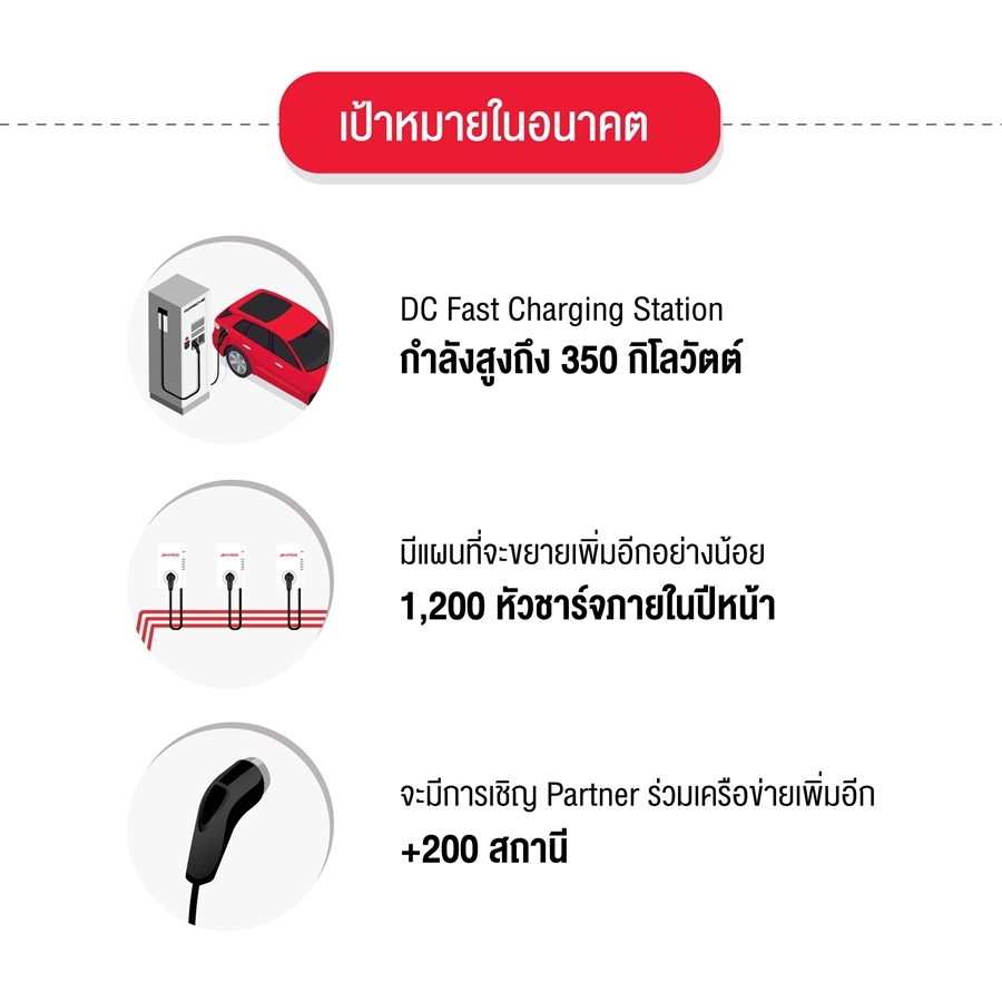 - พันธมิตรผู้ประกอบการธุรกิจโรงแรมหัวเมืองใหญ่และเมืองท่องเที่ยว กลุ่มผู้ประกอบการในหัวเมืองต่างๆเป็นอีกหนึ่งพันธมิตรที่จะร่วมพัฒนาสถานีชาร์จ EV แบบ High Power Charging Station ในต่างจังหวัดตามหัวเมืองใหญ่และเมืองท่องเที่ยว เพื่อรองรับการใช้งานของลูกค้าให้ครอบคลุมมากขึ้น โดยขณะนี้มีสถานีให้บริการแล้วที่โรงแรม The Standard หัวหิน เป็นสถานีนำร่อง