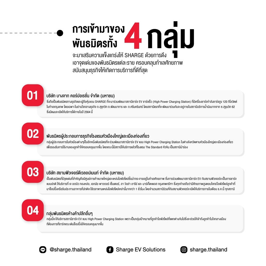 การเข้ามาของพันธมิตรทั้ง 4 กลุ่ม จะมาเสริมความแข็งแกร่งให้ SHARGE ด้วยการดึงเอาจุดเด่นของพันธมิตรแต่ละราย ครอบคลุมทำเลศักยภาพ สนับสนุนธุรกิจให้เกิดการบริการที่ดีที่สุด สร้าง EV Charging Ecosystem อย่างครบด้าน และอำนวยความสะดวกให้กับลูกค้าได้อย่างมีประสิทธิภาพ เนื่องจากพันธมิตรแต่ละรายมีสถานที่ให้พัฒนาเป็นสถานีชาร์จ EV ในทำเลที่แตกต่างกัน เริ่มต้นจาก