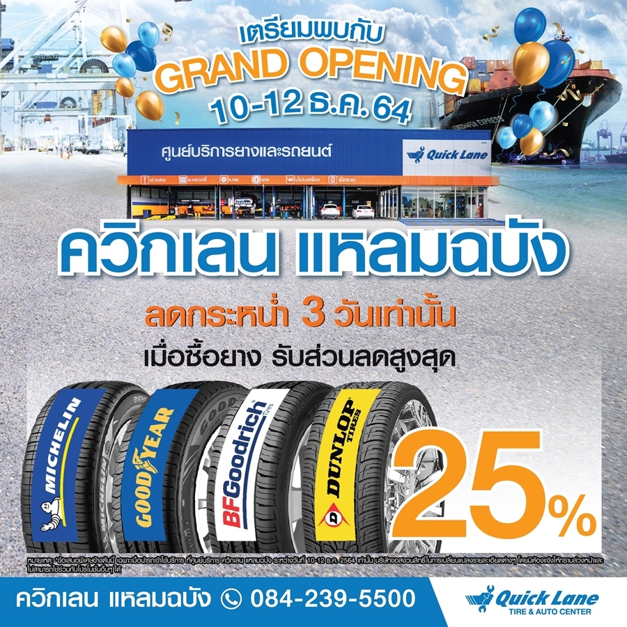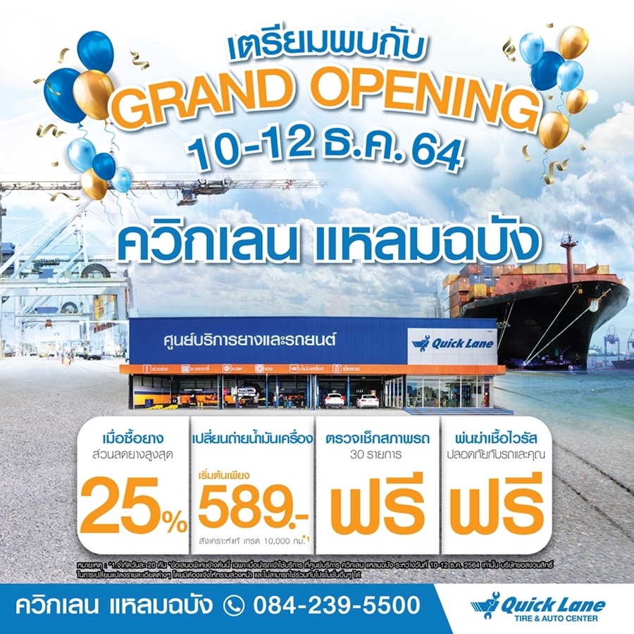 สำหรับ ควิกเลน แหลมฉบัง ซึ่งเป็นสาขาที่ 2 ในจังหวัดชลบุรี เพื่อรองรับความต้องการซ่อมบำรุงรักษารถยนต์ ของผู้ใช้รถทุกรุ่น ทุกยี่ห้อ ในย่านนิคมอุตสาหกรรมแหลมฉบัง ตลอดจนพื้นที่อำเภอบางละมุง และทั่วทั้งจังหวัดชลบุรี เตรียมฉลองเปิดสาขาอย่างเป็นทางการในวันที่ 10-12 ธันวาคม 2564 พร้อมกับโปรโมชั่นสุดพิเศษ ไม่ว่าจะเป็น