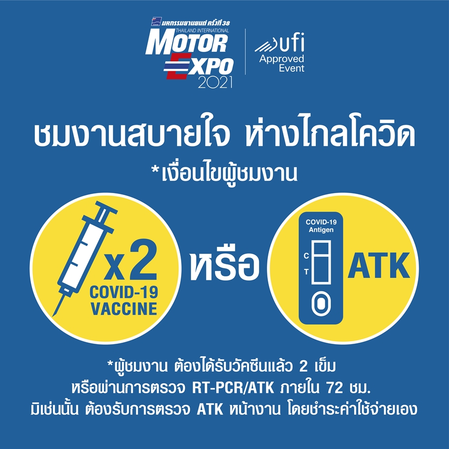 ขวัญชัย ปภัสร์พงษ์ ประธานจัดงาน มหกรรมยานยนต์ ครั้งที่ 38 เปิดเผยว่า “ขณะนี้ผ่านครึ่งทางการจัดงานด้วยความราบรื่น ทุกฝ่ายที่เกี่ยวข้องให้ความร่วมมือ ปฏิบัติตามมาตรการป้องกันการแพร่ระบาดของ COVID-19 อย่างเคร่งครัด รวมถึงผู้เข้าชมงานก็ให้ความร่วมมือเป็นอย่างดี ถึงแม้จะมีขั้นตอนการเข้าชมเพิ่มขึ้น ทั้งนี้ต้องขอขอบคุณภาครัฐและทุกหน่วยงาน ที่ให้คำปรึกษาแนะนำเรื่องการกำหนดมาตรการต่างๆ ตลอดจนพันธมิตร Finno-Health ที่ให้บริการตรวจ ATK ผู้เกี่ยวข้องในการจัดงานทุก 7 วัน และ โรงพยาบาลบางประกอก 9 สนับสนุนตรวจ ATK ผู้เข้าชมงานทั่วไปที่ยังรับวัคซีนไม่ครบ 2 เข็ม ในราคาพิเศษเพียง 99 บาท”