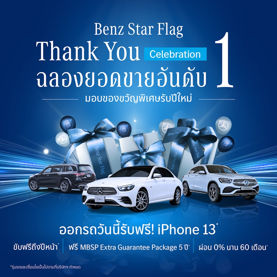 สำหรับในช่วงโค้งสุดท้ายของปี 2564 กรรมการผู้จัดการใหญ่ บริษัท สตาร์แฟลก จำกัด เปิดเผยว่า จากสถิติยอดจำหน่ายเมอร์เซเดส-เบนซ์ ปี 2564 เรามั่นใจว่า เบนซ์ สตาร์แฟลก สามารถครองแชมป์ยอดขายอันดับ 1 ได้อีกครั้ง นับเป็นเวลาต่อเนื่องถึง 8 ปี การันตีถึงคุณภาพและมาตรฐานของการบริการและการเอาใจใส่เพื่อสร้างความพึงพอใจสูงสุดให้ลูกค้า เพื่อฉลองความสำเร็จนี้ เบนซ์ สตาร์แฟลก ได้จัดแคมเปญส่งเสริมการขายพิเศษแทนคำขอบคุณลูกค้า โดยได้จัดเตรียม iPhone เพิ่มอีก 100 เครื่อง เพื่อเป็นของขวัญปีใหม่ให้ลูกค้าที่ออกรถภายในสิ้นปีนี้ พร้อมเซอร์วิสแพ็คเกจ MBSP Extra Guarantee Package ที่ให้ความอุ่นใจตลอดการใช้งานถึง 5 ปี นอกจากนี้ยังจัดส่วนลดและข้อเสนอพิเศษให้ทุกรุ่น