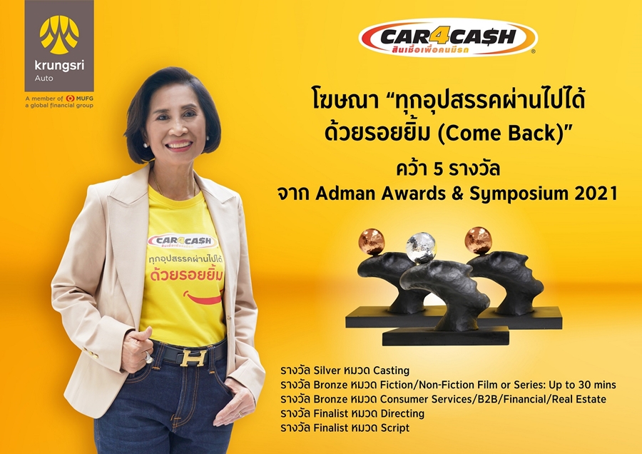 ภาพยนตร์โฆษณา คาร์ ฟอร์ แคช ทุกอุปสรรคผ่านไปได้ด้วยรอยยิ้ม (Come Back) ที่ร่วมสร้างสรรค์โดยกรุงศรี ออโต้ TBWAThailand และ Suneta House คว้า 5 รางวัลจากงาน Adman Awards & Symposium 2021 สะท้อนถึงกลยุทธ์การสื่อสารการตลาดที่โดดเด่น ด้วยการนำเสนอผลงานสร้างสรรค์ที่น่าจดจำและร่วมสมัย ควบคู่ไปกับการตอบโจทย์ทางธุรกิจอย่างมีประสิทธิภาพ
