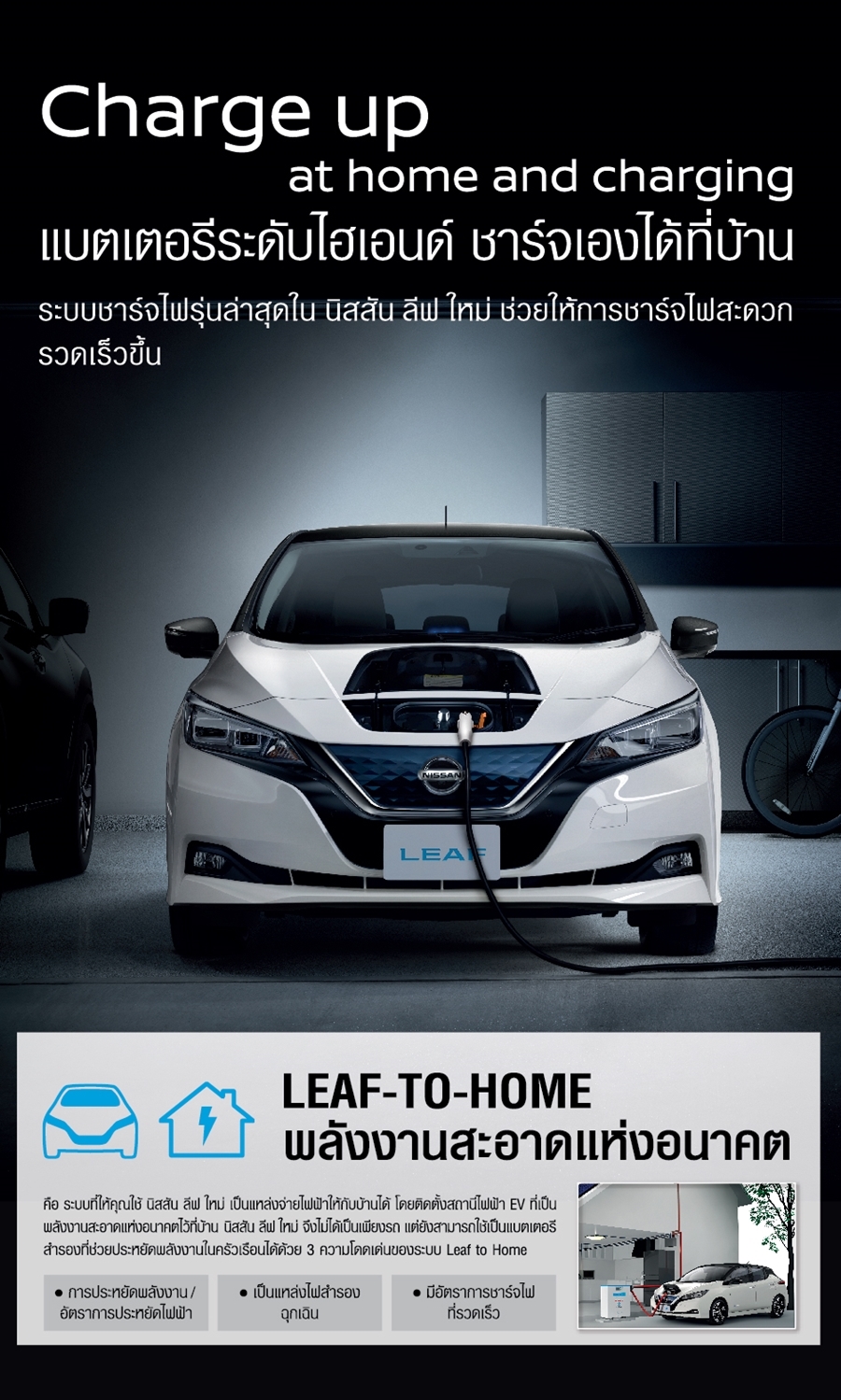 Nissan LEAF มีชื่อเสียงในการมอบประสบการณ์การขับขี่ที่ไม่เหมือนใคร ด้วยระบบส่งกําลังขั้นสูง เร่งความเร็วได้อย่างราบรื่นและตอบสนองได้ดี ขับขี่ได้อย่างมั่นคง และให้ความเงียบ นิสสัน ลีฟ ได้เปิดตัวในฐานะรถยนต์ไฟฟ้า 100% คันแรกของโลกที่ออกแบบมาสําหรับตลาดมวลชนและเป็นหนึ่งในรถยนต์ไฟฟ้าเพียงไม่กี่รุ่นที่จำหน่ายในประเทศไทย และสามารถผลิตไฟฟ้าให้กับที่พักอาศัย (V2H) ได้โดยตรง ผ่านการชาร์จด้วยระบบชาร์จ CHAdeMO ที่ได้ออกแบบตั้งแต่เริ่มต้นเพื่อรองรับการชาร์จแบบสองทิศทาง ซึ่งได้รับการรับรองในหลายประเทศทั่วโลก นิสสัน ลีฟ จึงสามารถรองรับระบบผลิตไฟฟ้าสำหรับที่พักอาศัย เชื่อมต่อกับระบบโครงข่ายไฟฟ้าและอื่น ๆ ได้ตามความต้องการของผู้ใช้รถยนต์ควบคู่ไปพร้อมกันถึงสองระบบ เท่ากับเป็นการเพิ่มความหลากหลายในการใช้งาน เสถียรภาพของพลังงาน และความมั่นใจ จึงทำให้ผู้ใช้รถยนต์มีความอุ่นใจได้ ไม่ว่าจะเป็นการขับขี่รถยนต์บนท้องถนนหรือใช้งานที่บ้าน