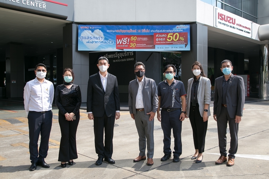 กลุ่มอีซูซุ ร่วมกับ กรมควบคุมมลพิษ กระทรวงทรัพยากรธรรมชาติและสิ่งแวดล้อม โดย คุณอรรถพล เจริญชันษา อธิบดีกรมควบคุมมลพิษ เยี่ยมชมศูนย์บริการมาตรฐานอีซูซุ รณรงค์เชิญชวนลูกค้าเข้าร่วมโครงการ ดูแลรถเก่า เพื่ออากาศสดใส โดยนำรถอีซูซุที่มีอายุตั้งแต่ 15 ปีขึ้นไป เข้าศูนย์บริการมาตรฐานอีซูซุ* รับบริการตรวจเช็กฟรีกว่า 30 รายการสำหรับรถปิกอัพและรถนั่งอเนกประสงค์ และฟรีกว่า 50 รายการสำหรับรถบรรทุกขนาดกลางและใหญ่ พร้อมรับส่วนลดสูงสุดถึง 50%** สำหรับค่าแรงและค่าอะไหล่ที่เกี่ยวข้องกับการลดมลพิษทางอากาศ***