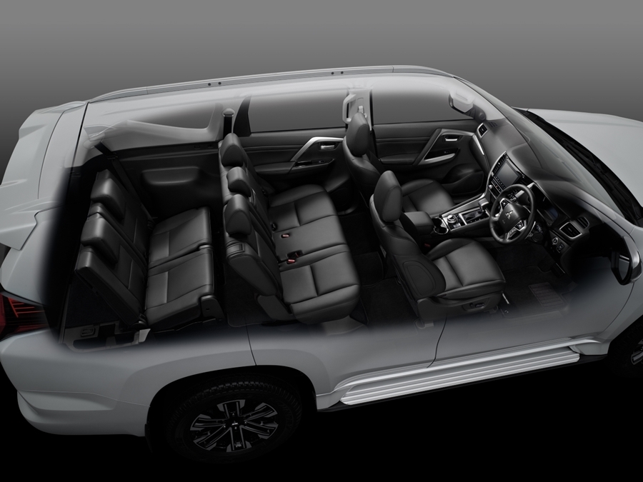 Advanced Dynamic Shield เส้นสายการออกแบบมีความทันสมัยจากภายนอกจรดภายใน ห้องโดยสารกว้างขวางและมีความหรูหรา ตกแต่งด้วยวัสดุบุนุ่มที่ช่วยเพิ่มระดับความพรีเมียม สะดวกสบายยิ่งขึ้นในทุกการเดินทางด้วยช่องจ่ายไฟฟ้าขนาด 220V พร้อมที่ชาร์จแบตเตอรี่โทรศัพท์มือถือแบบไร้สาย มีระบบฟอกอากาศ และระบบปรับอากาศสำหรับเบาะนั่งแถวที่ 2 และ 3 ผู้โดยสารตอนหลังยังสามารถเพลิดเพลินกับระบบความบันเทิงตลอดการเดินทางด้วยจอภาพขนาด 12.1 นิ้ว ติดตั้งบนเพดานรถ พร้อมรีโมทคอนโทรล รองรับการเชื่อมต่อผ่าน USB และสมาร์ทโฟนผ่าน HDMI