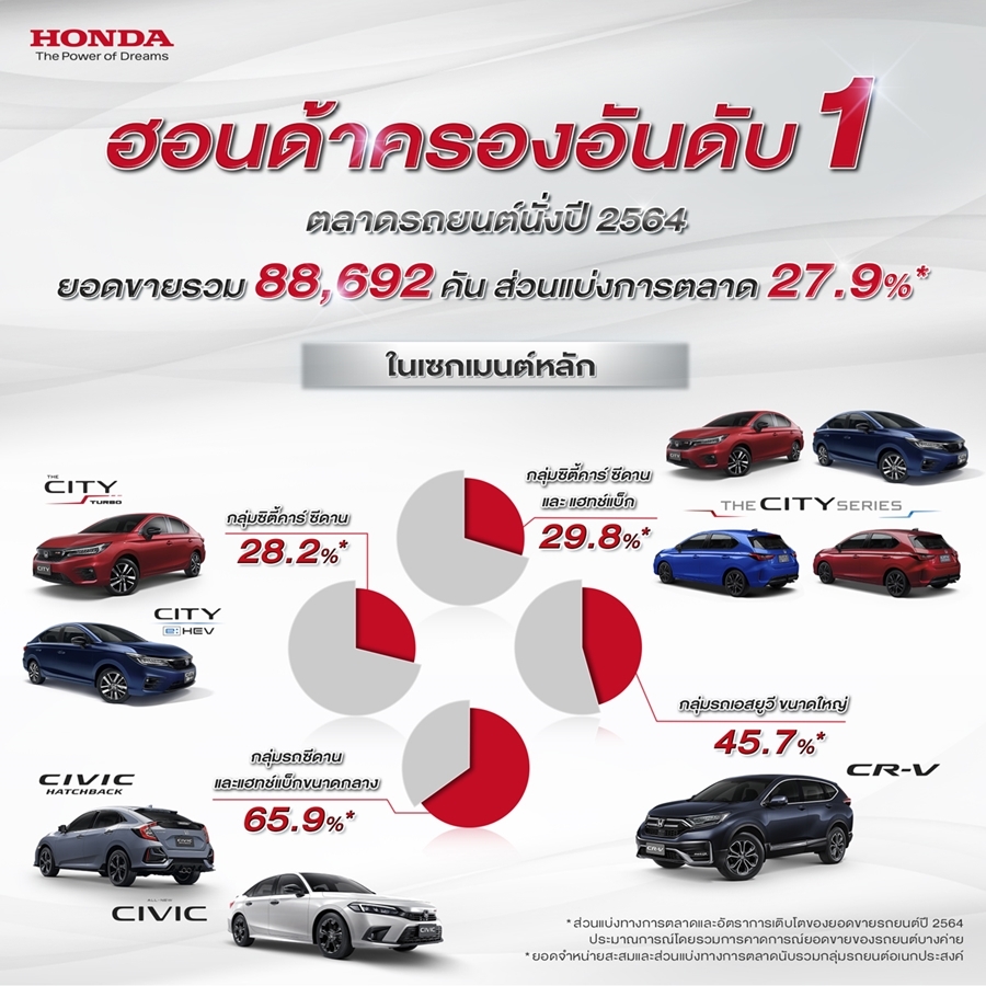 บริษัท ฮอนด้า ออโตโมบิล (ประเทศไทย) จำกัด ประกาศผลการดำเนินงานประจำปี 2564 สามารถครองอันดับ 1 ตลาดรถยนต์นั่งส่วนบุคคลปี 2564 ในประเทศไทย (มกราคม - ธันวาคม 2564) ด้วยยอดจำหน่ายสะสมรวม 88,692 คัน ครองส่วนแบ่งทางการตลาด 27.9% และครองอันดับ 1 ต่อเนื่องอีกปี อีกทั้งเป็นผู้นำใน 4 เซกเมนต์หลัก ตอกย้ำการเป็นแบรนด์ยอดนิยมในประเทศไทย พร้อมเดินหน้าสร้างความพึงพอใจสูงสุดให้แก่ลูกค้าด้วยการยกระดับการบริการหลังการขายที่ตอบโจทย์ไลฟ์สไตล์ที่หลากหลาย ภายใต้มาตรฐานเดียวกันจากโชว์รูมและศูนย์บริการ 229 แห่งทั่วประเทศ