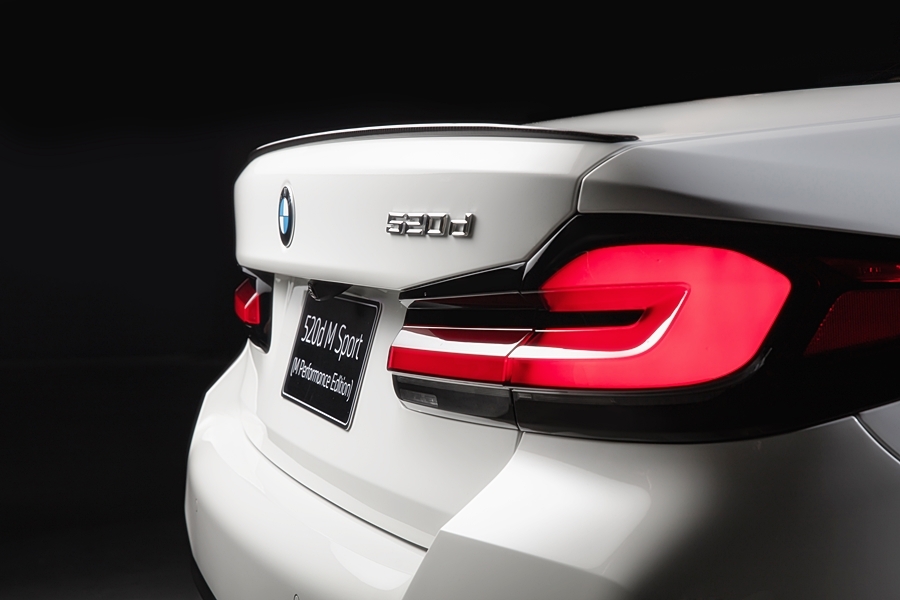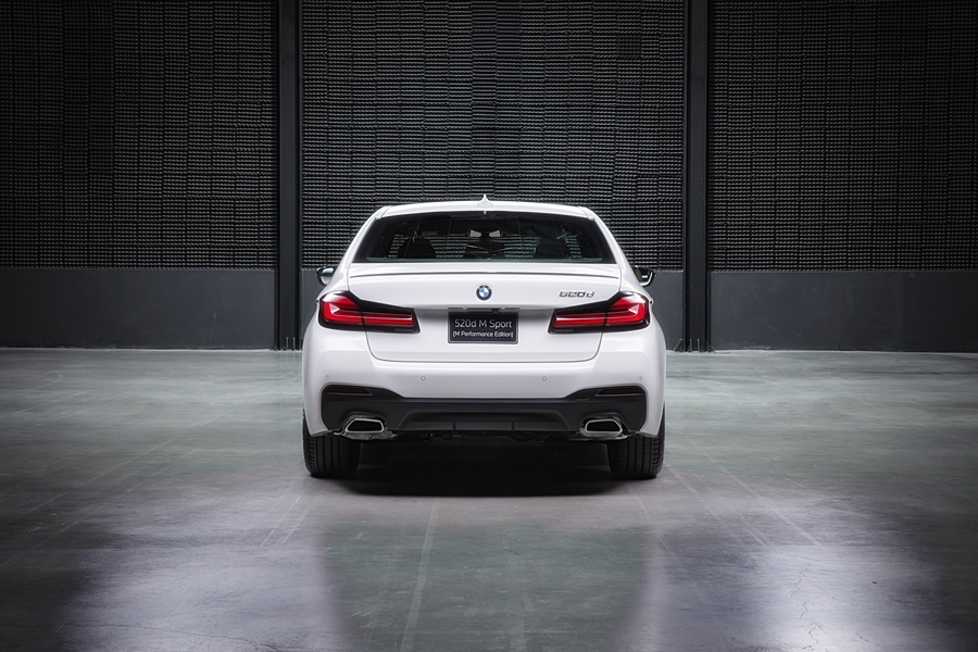 ดีไซน์ด้านท้ายรถของบีเอ็มดับเบิลยู 520d M Sport (M Performance Edition) สื่อถึงรูปลักษณ์ที่ผสานความสง่างามและล้ำสมัยด้วยเส้นสายที่คมชัดและทรงพลังเช่นเดียวกัน ไฟท้าย LED มาในรูปแบบสามมิติทรงตัว L รับกับไฟหน้า โฉบเฉี่ยวด้วยกรอบสีดำ สร้างความสะดุดตาบนท้องถนน โดยทั้งไฟท้ายและไฟเบรกได้รับการออกแบบมาให้กลมกลืนเป็นหนึ่งเดียว ทำให้รถยนต์รุ่นนี้มีรูปโฉมไม่ซ้ำใคร
