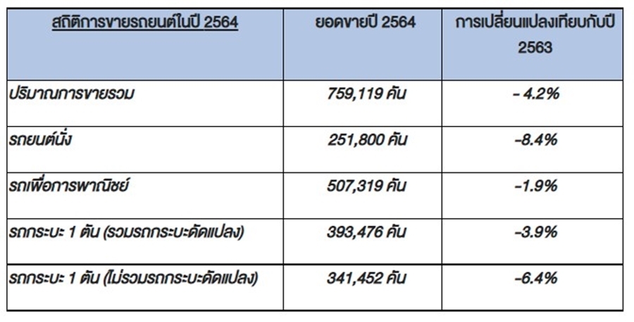 สถิติการจำหน่ายรถยนต์ เดือนมกราคม – ธันวาคม 2564