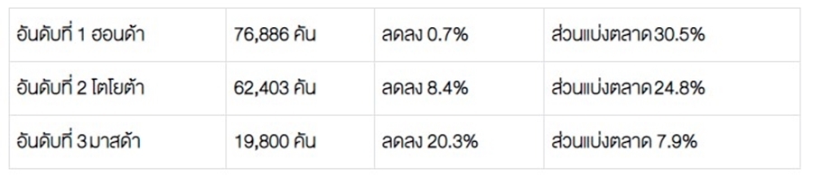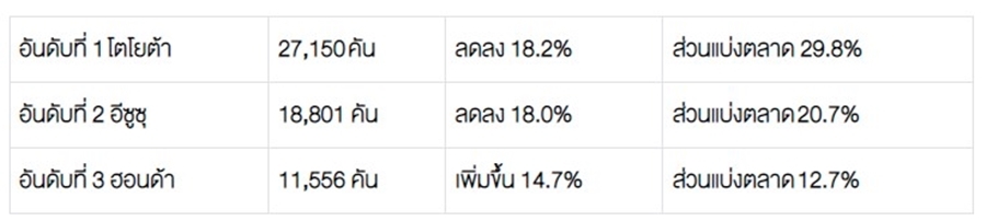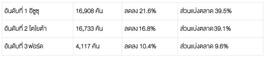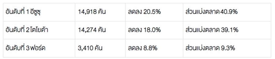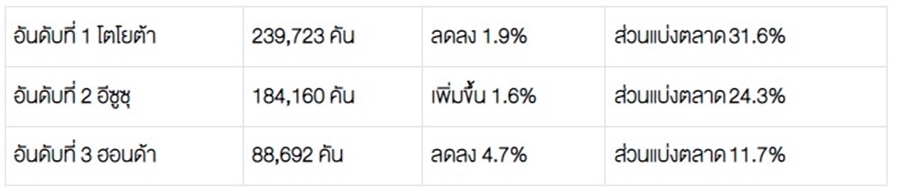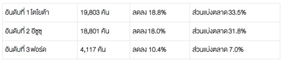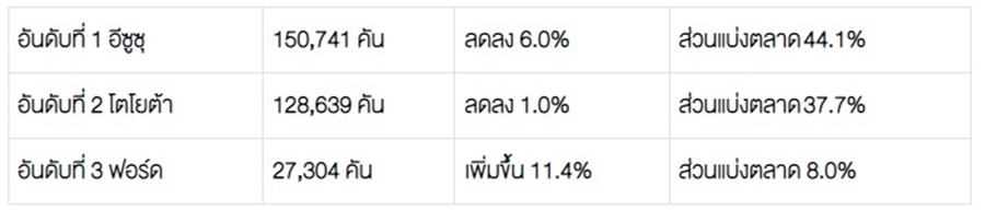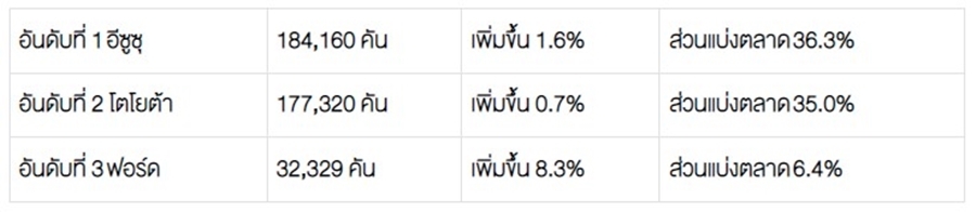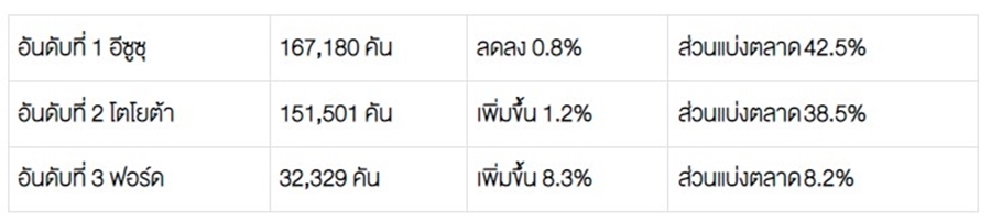 โตโยต้า 22,862 คัน – อีซูซุ 16,439 คัน – มิตซูบิชิ 6,619 คัน – ฟอร์ด 5,025 คัน – นิสสัน 1,079 คัน