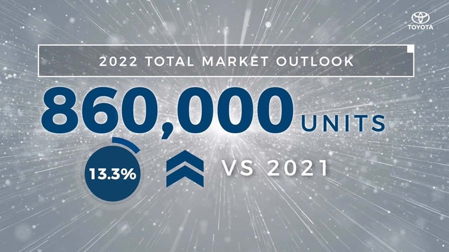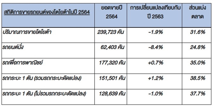มร. ยามาชิตะ เผยถึงยอดขายของโตโยต้าในปีที่ผ่านมาว่า "สำหรับยอดขายของโตโยต้าในปี 2564 นั้น ยอดขายรวมของเราอยู่ที่ประมาณ 239,723 คัน หรือลดลง 1.9% เมื่อเทียบกับปีที่ผ่านมา และเรายังคงครองส่วนแบ่งทางการตลาดเป็นอันดับ 1 หรือเท่ากับ 31.6% ของยอดขายรถยนต์ทั้งหมด ซึ่งหากว่ากันตามตรง ถือว่าต่ำกว่าที่เราคาดการณ์ไว้ แต่ถ้าเราดูยอดขายของปีที่แล้วจะเห็นได้ว่าสถานการณ์ของเราเริ่มฟื้นตัวดีขึ้นตั้งแต่ไตรมาสที่ 2 เป็นต้นมา สืบเนื่องมาจากการพัฒนาผลิตภัณฑ์ให้ดียิ่งขึ้น ตลอดจนการดำเนินกิจกรรมทางการตลาดที่สอดคล้องกับวิถีชีวิตแบบใหม่ เช่น การขายผ่านช่องทางออนไลน์